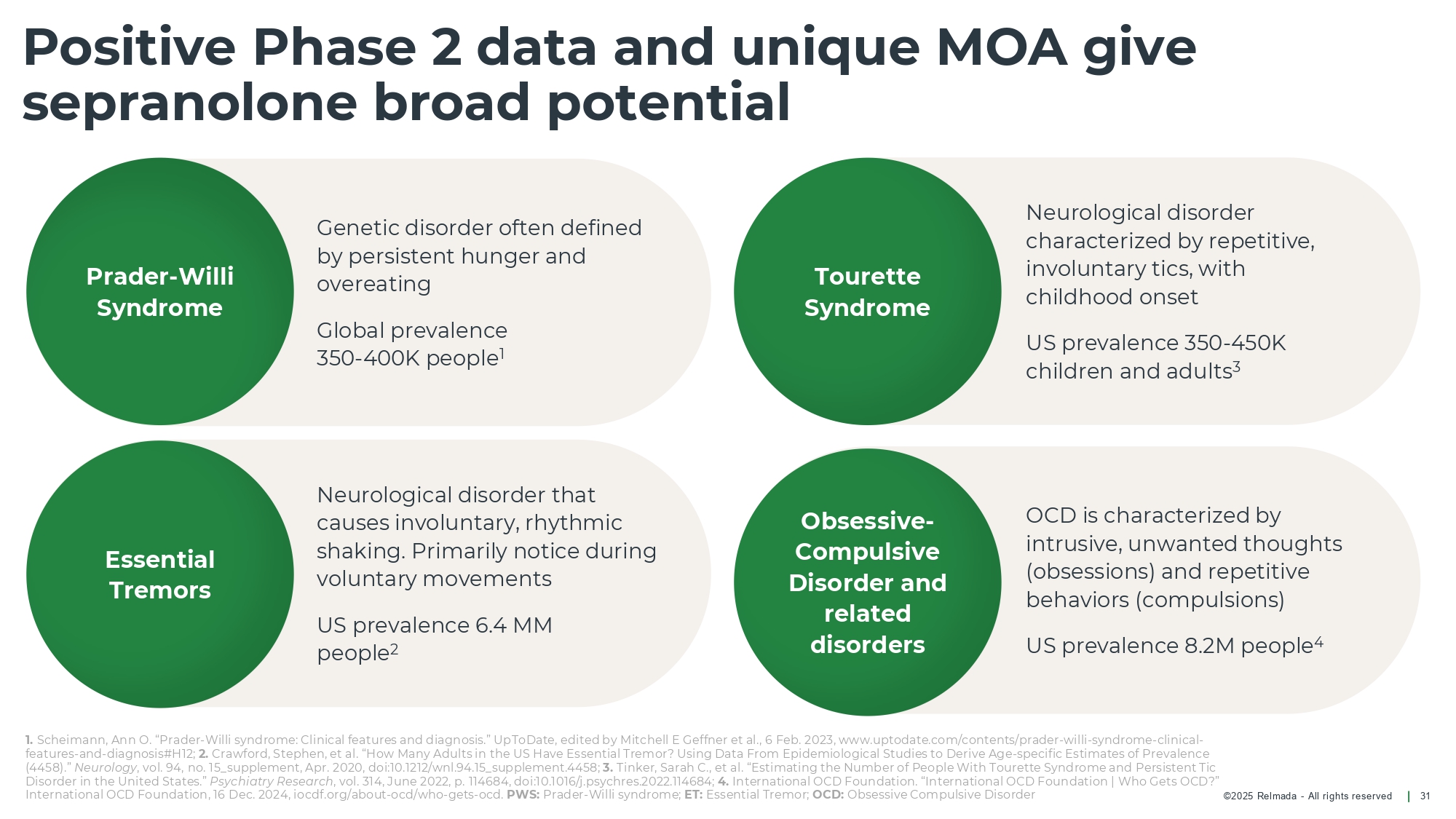 ©2025 Relmada - All rights reserved OCD is characterized by intrusive, unwanted thoughts (obsessions) and repetitive behaviors (compulsions) US prevalence 8.2M people 4 Neurological disorder characterized by repetitive, involuntary tics, with childhood onset US prevalence 350 - 450K children and adults 3 Neurological disorder that causes involuntary, rhythmic shaking. Primarily notice during voluntary movements US prevalence 6.4 MM people 2 Genetic disorder often defined by persistent hunger and overeating Global prevalence 350 - 400K people 1 Positive Phase 2 data and unique MOA give sepranolone broad potential 31 Prader - Willi Syndrome Essential Tremors Tourette Syndrome Obsessive - Compulsive Disorder and related disorders 1. Scheimann, Ann O. “Prader - Willi syndrome: Clinical features and diagnosis.” UpToDate, edited by Mitchell E Geffner et al., 6 Feb. 2023, www.uptodate.com/contents/prader - willi - syndrome - clinical - features - and - diagnosis#H12; 2. Crawford, Stephen, et al. “How Many Adults in the US Have Essential Tremor? Using Data From Epidemiological Studies to Derive Age - specific Estimates of Prevalence (4458).” Neurology , vol. 94, no. 15_supplement, Apr. 2020, doi:10.1212/wnl.94.15_supplement.4458; 3. Tinker, Sarah C., et al. “Estimating the Number of People With Tourette Syndrome and Persistent Tic Disorder in the United States.” Psychiatry Research , vol. 314, June 2022, p. 114684, doi:10.1016/j.psychres.2022.114684; 4. International OCD Foundation. “International OCD Foundation | Who Gets OCD?” International OCD Foundation, 16 Dec. 2024, iocdf.org/about - ocd/who - gets - ocd. PWS: Prader - Willi syndrome; ET: Essential Tremor; OCD: Obsessive Compulsive Disorder
