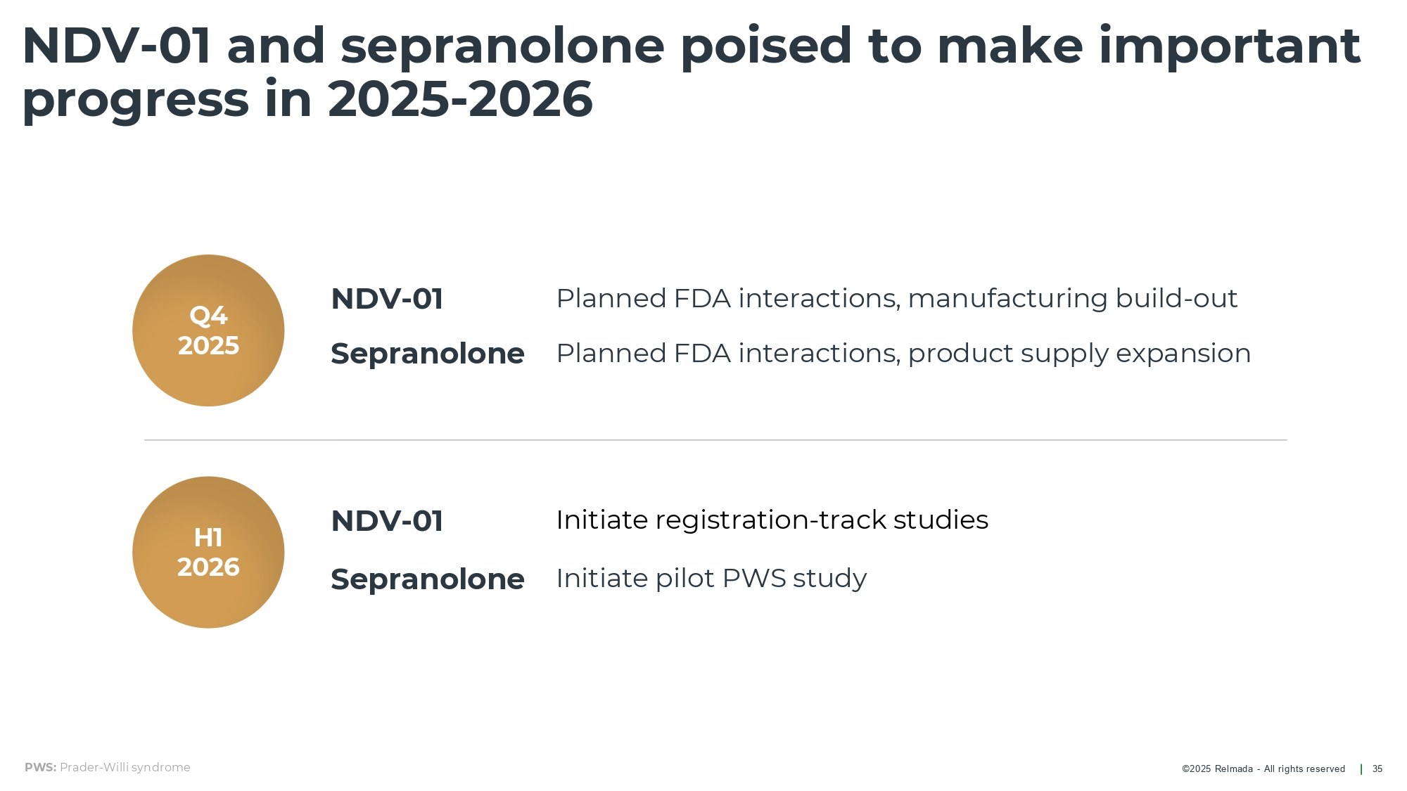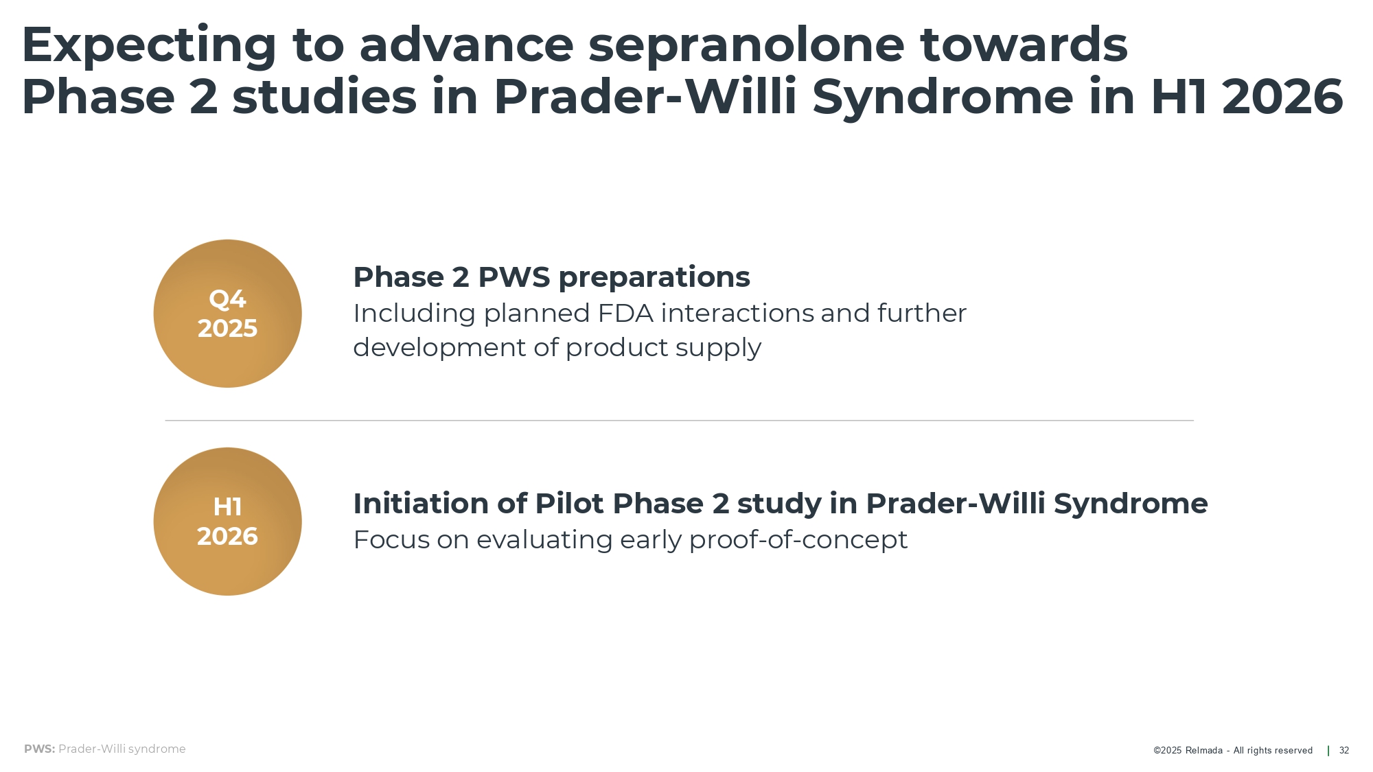 ©2025 Relmada - All rights reserved Expecting to advance sepranolone towards Phase 2 studies in Prader - Willi Syndrome in H1 2026 32 Phase 2 PWS preparations Including planned FDA interactions and further development of product supply Initiation of Pilot Phase 2 study in Prader - Willi Syndrome Focus on evaluating early proof - of - concept PWS: Prader - Willi syndrome Q4 2025 H1 2026