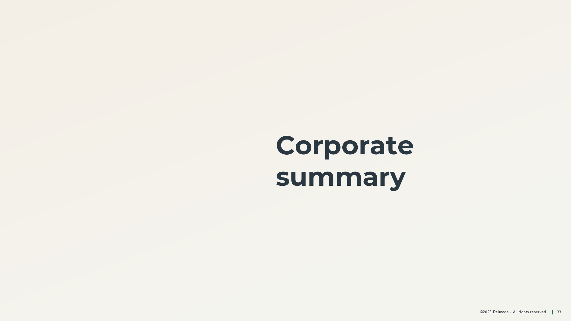©2025 Relmada - All rights reserved 33 Corporate summary