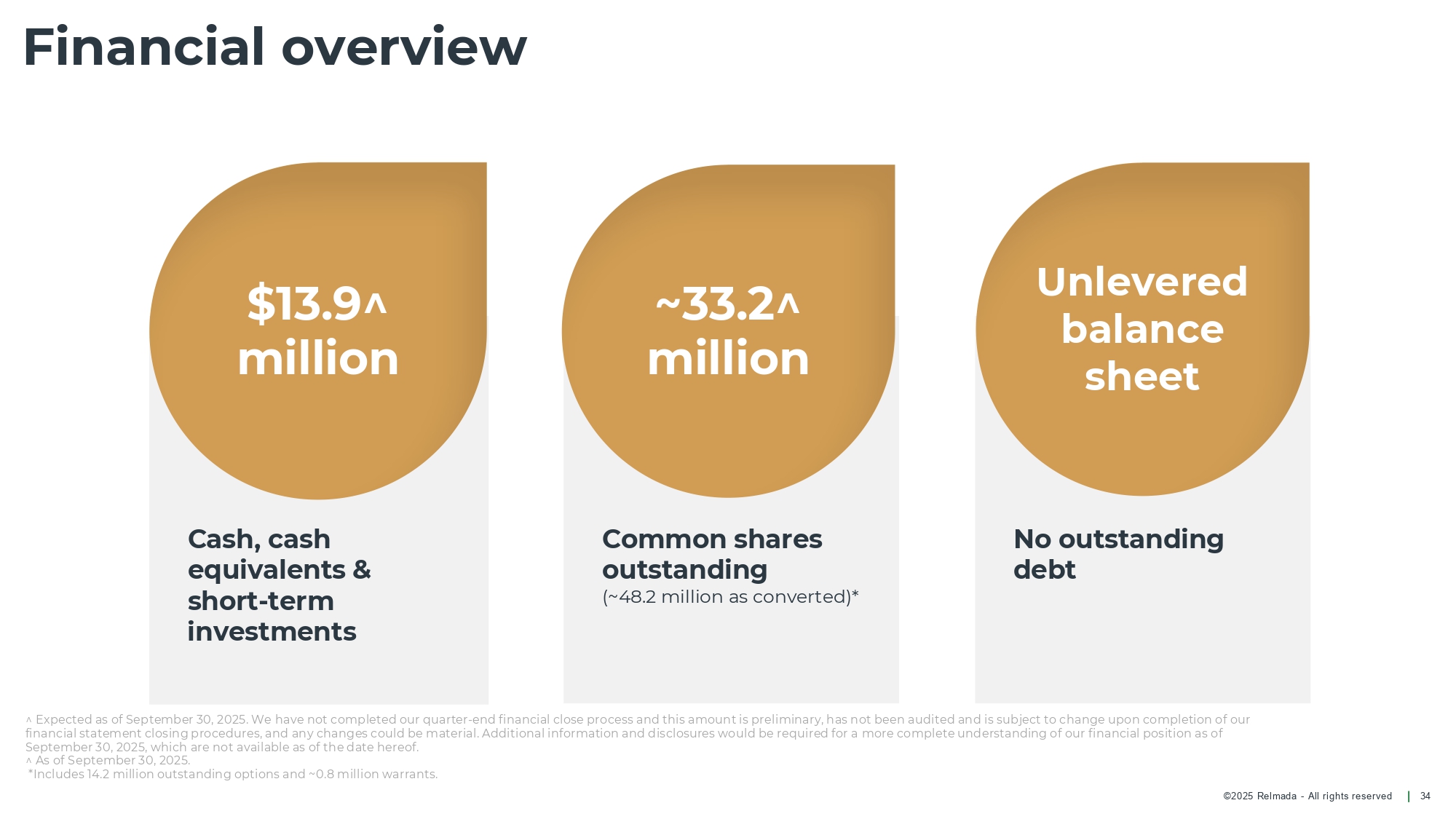 ^ Expected as of September 30, 2025. We have not completed our quarter - end financial close process and this amount is preliminary, has not been audited and is subject to change upon completion of our financial statement closing procedures, and any changes could be material. Additional information and disclosures would be required for a more complete understanding of our financial position as of September 30, 2025, which are not available as of the date hereof. ^ As of September 30, 2025. *Includes 14.2 million outstanding options and ~0.8 million warrants. ©2025 Relmada - All rights reserved Financial overview 34 Common shares outstanding (~48.2 million as converted)* Cash, cash equivalents & short - term investments No outstanding debt $13.9^ million ~33.2^ million Unlevered balance sheet
