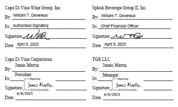 This Settlement Agreement (the “Agreement”), dated April 4, 2025 (the “Effective Date”), is made by and between the following parties (collectively, the “Parties”): Copa Di Vino Wine Group, Inc. (a Nevada corporation) and Splash Beverage Group II, Inc. (a Nevada corporation) (collectively, “Splash”) on the one hand; and Copa Di Vino Corporation (an Oregon corporation) (“CDVC”) on the other hand.