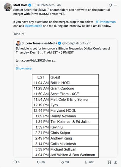 The following communication was posted on X.com by Matthew Cole, Chief Executive Officer of Strive, Inc. (“Strive”), on December 18, 2025, in connection with Strive’s proposed business combination with Semler Scientific, Inc. (“Semler Scientific”).