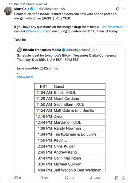 The following communication was reposted on X.com by Pierre Rochard, Board Member of Strive, Inc. (“Strive”), on December 18, 2025, in connection with Strive’s proposed business combination with Semler Scientific, Inc. (“Semler Scientific”).