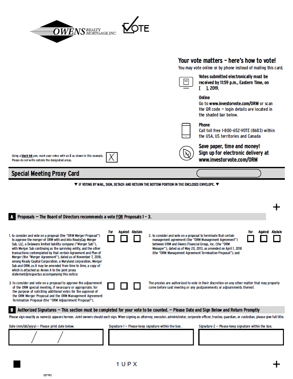 Your vote matters – here’s how to vote! You may vote online or by phone instead of mailing this card. Votes submitted electronically must be received by 11:59 p.m., Eastern Time, on February 27, 2019. Online Go to www.investorvote.com/ORM or scan the QR code — login details are located in the shaded bar below. Phone Call toll free 1-800-652-VOTE (8683) within the USA, US territories and Canada Save paper, time and money! Sign up for electronic delivery at www.investorvote.com/ORM Using a black ink pen, mark your votes with an X as shown in this example. Please do not write outside the designated areas. q IF VOTING BY MAIL, SIGN, DETACH AND RETURN THE BOTTOM PORTION IN THE ENCLOSED ENVELOPE. q + Abstain For Against Abstain ForAgainst 1. to consider and vote on a proposal (the ‘’ORM Merger Proposal’’) to approve the merger of ORM with and into ReadyCap Merger Sub, LLC, a Delaware limited liability company (‘’Merger Sub’’), with Merger Sub continuing as the surviving entity, and the other transactions contemplated by that certain Agreement and Plan of Merger (the ‘’Merger Agreement’’), dated as of November 7, 2018, among Ready Capital Corporation, a Maryland corporation, Merger Sub and ORM, as it may be amended from time to time, a copy of which is attached as Annex A to the joint proxy statement/prospectus accompanying this notice; 2. to consider and vote on a proposal to terminate that certain management agreement (the ‘’ORM Management Agreement’’) between ORM and Owens Financial Group, Inc. (the ‘’ORM Manager’’), dated as of May 20, 2013, as amended on April 1, 2018 (the ‘’ORM Management Agreement Termination Proposal’’); and 3. to consider and vote on a proposal to approve the adjournment of the ORM special meeting, if necessary or appropriate, for the purpose of soliciting additional votes for the approval of the ORM Merger Proposal and the ORM Management Agreement Termination Proposal (the ‘’ORM Adjournment Proposal’’). The proxies are authorized to vote in their discretion on any other matter that may properly come before said meeting or any postponements or adjournments thereof. Please sign exactly as name(s) appears hereon. Joint owners should each sign. When signing as attorney, executor, administrator, corporate officer, trustee, guardian, or custodian, please give full title. Date (mm/dd/yyyy) — Please print date below. Signature 1 — Please keep signature within the box. Signature 2 — Please keep signature within the box. + 1 U P X 02YYKC B Authorized Signatures — This section must be completed for your vote to be counted. — Please Date and Sign Below and Return Promptly A Proposals — The Board of Directors recommends a vote FOR Proposals 1 – 3. Special Meeting Proxy Card