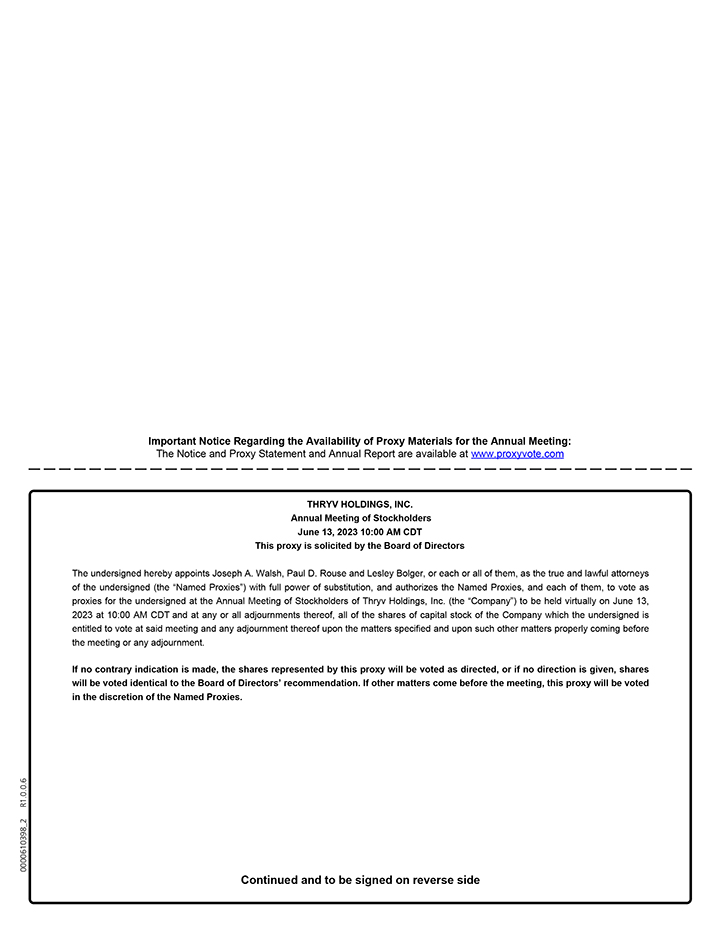 You are cordially invited to attend the 2023 Annual Meeting of Stockholders of Thryv Holdings, Inc., which will be held virtually at https://www.virtualshareholdermeeting.com/THRY2023 on June 13, 2023 at 10 a.m. Central Time. The Annual Meeting will be held in a virtual meeting format only and you will not be able to attend in person. Instructions for accessing the virtual meeting platform online are included in the proxy statement for this meeting.