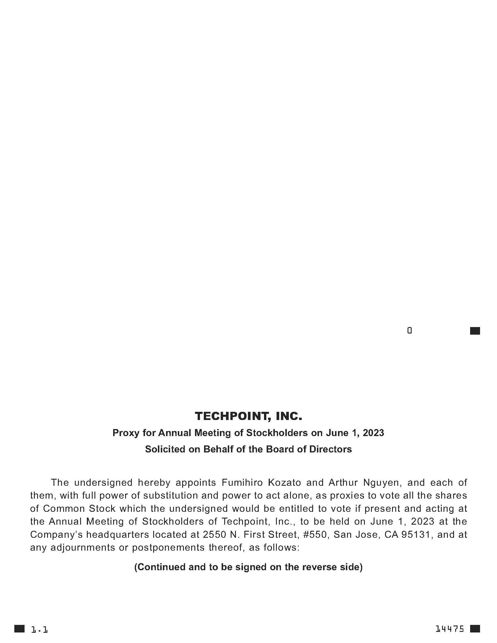 0 TECHPOINT, INC. Proxy for Annual Meeting of Stockholders on June 1, 2023 Solicited on Behalf of the Board of Directors The undersigned hereby appoints Fumihiro Kozato and Arthur Nguyen, and each of them, with full power of substitution and power to act alone, as proxies to vote all the shares of Common Stock which the undersigned would be entitled to vote if present and acting at the Annual Meeting of Stockholders of Techpoint, Inc., to be held on June 1, 2023 at the Company’s headquarters located at 2550 N. First Street, #550, San Jose, CA 95131, and at any adjournments or postponements thereof, as follows: (Continued and to be signed on the reverse side) 1.1 14475