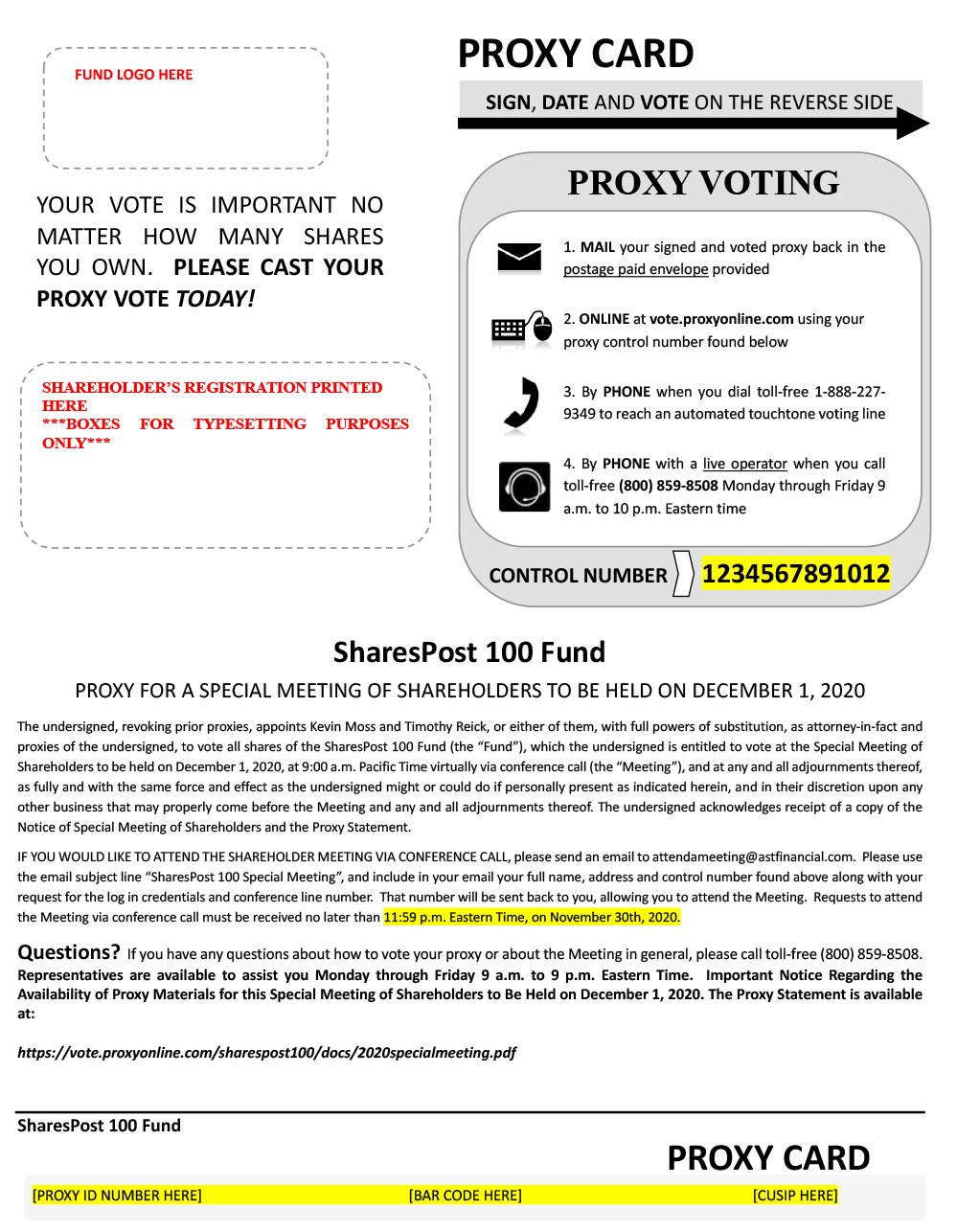 On Tuesday, December 1, 2020, SharesPost 100 Fund (the “Fund”) will hold a Special Meeting of Shareholders (the “Special Meeting”) virtually at 9:00 a.m. Pacific time.