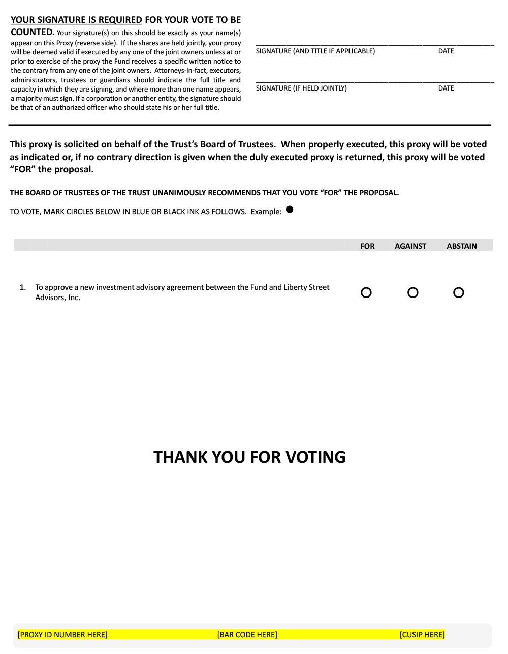 On October 2, 2020 the Board held a meeting to evaluate the New Advisory Agreement. After careful consideration, the Board, including all of the Independent Trustees (as defined herein), unanimously approved the New Advisory Agreement. You are being asked to vote on the proposal to approve the New Advisory Agreement (the “Proposal”).