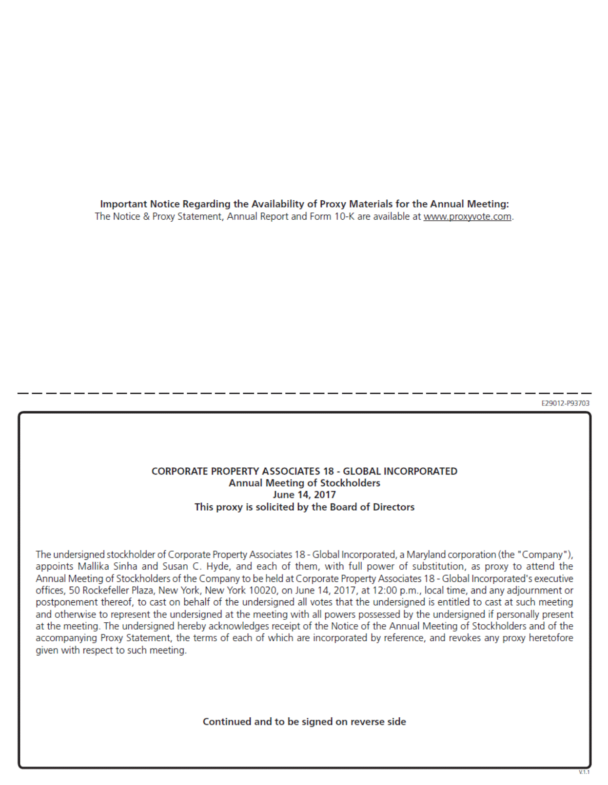Important Notice Regarding the Availability of Proxy Materials for the Annual Meeting: The Notice & Proxy Statement, Annual Report and Form 10-K are available at www.proxyvote.com. E29012-P93703 CORPORATE PROPERTY ASSOCIATES 18 - GLOBAL INCORPORATED Annual Meeting of Stockholders June 14, 2017 This proxy is solicited by the Board of Directors The undersigned stockholder of Corporate Property Associates 18 - Global Incorporated, a Maryland corporation (the "Company"), appoints Mallika Sinha and Susan C. Hyde, and each of them, with full power of substitution, as proxy to attend the Annual Meeting of Stockholders of the Company to be held at Corporate Property Associates 18 - Global Incorporated's executive offices, 50 Rockefeller Plaza, New York, New York 10020, on June 14, 2017, at 12:00 p.m., local time, and any adjournment or postponement thereof, to cast on behalf of the undersigned all votes that the undersigned is entitled to cast at such meeting and otherwise to represent the undersigned at the meeting with all powers possessed by the undersigned if personally present at the meeting. The undersigned hereby acknowledges receipt of the Notice of the Annual Meeting of Stockholders and of the accompanying Proxy Statement, the terms of each of which are incorporated by reference, and revokes any proxy heretofore given with respect to such meeting. Continued and to be signed on reverse side V.1.1