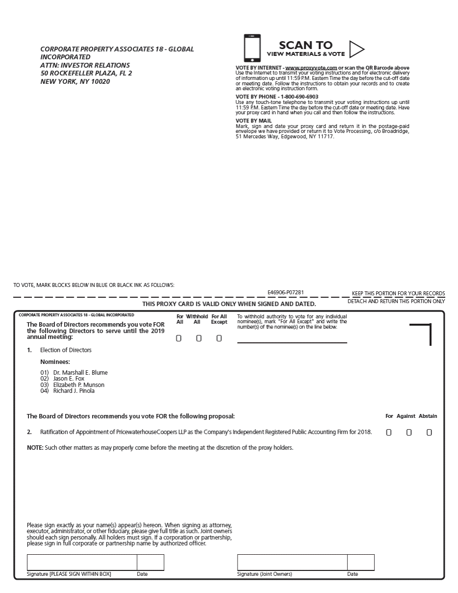 VIEW MATERIALS & VOTE w SCAN TO CORPORATE PROPERTY ASSOCIATES 18 - GLOBAL INCORPORATED ATTN: INVESTOR RELATIONS 50 ROCKEFELLER PLAZA, FL 2 NEW YORK, NY 10020 VOTE BY INTERNET - www.proxyvote.com or scan the QR Barcode above Use the Internet to transmit your voting instructions and for electronic delivery of information up until 11:59 P.M. Eastern Time the day before the cut-off date or meeting date. Follow the instructions to obtain your records and to create an electronic voting instruction form. VOTE BY PHONE - 1-800-690-6903 Use any touch-tone telephone to transmit your voting instructions up until 11:59 P.M. Eastern Time the day before the cut-off date or meeting date. Have your proxy card in hand when you call and then follow the instructions. VOTE BY MAIL Mark, sign and date your proxy card and return it in the postage-paid envelope we have provided or return it to Vote Processing, c/o Broadridge, 51 Mercedes Way, Edgewood, NY 11717. TO VOTE, MARK BLOCKS BELOW IN BLUE OR BLACK INK AS FOLLOWS: E46906-P07281 KEEP THIS PORTION FOR YOUR RECORDS DETACH AND RETURN THIS PORTION ONLY THIS PROXY CARD IS VALID ONLY WHEN SIGNED AND DATED. CORPORATE PROPERTY ASSOCIATES 18 - GLOBAL INCORPORATED For Withhold For All AllAllExcept To withhold authority to vote for any individual nominee(s), mark "For All Except" and write the number(s) of the nominee(s) on the line below. The Board of Directors recommends you vote FOR the following Directors to serve until the 2019 annual meeting: ! ! ! 1.Election of Directors Nominees: 01) Dr. Marshall E. Blume 02) Jason E. Fox 03) Elizabeth P. Munson 04) Richard J. Pinola The Board of Directors recommends you vote FOR the following proposal: For Against Abstain ! ! ! 2.Ratification of Appointment of PricewaterhouseCoopers LLP as the Company's Independent Registered Public Accounting Firm for 2018. NOTE: Such other matters as may properly come before the meeting at the discretion of the proxy holders. Please sign exactly as your name(s) appear(s) hereon. When signing as attorney, executor, administrator, or other fiduciary, please give full title as such. Joint owners should each sign personally. All holders must sign. If a corporation or partnership, please sign in full corporate or partnership name by authorized officer. Signature [PLEASE SIGN WITHIN BOX] Date Signature (Joint Owners) Date