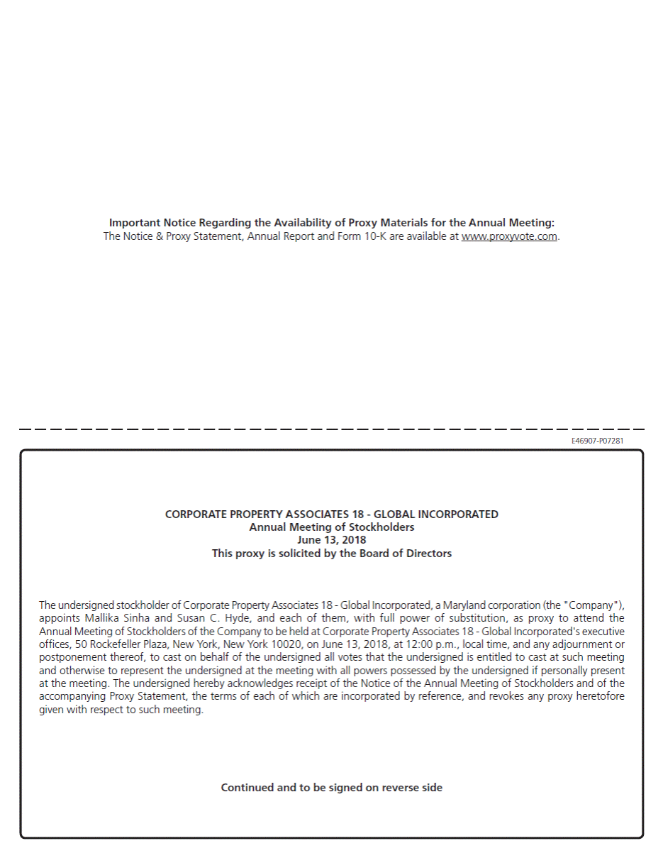 Important Notice Regarding the Availability of Proxy Materials for the Annual Meeting: The Notice & Proxy Statement, Annual Report and Form 10-K are available at www.proxyvote.com. E46907-P07281 CORPORATE PROPERTY ASSOCIATES 18 - GLOBAL INCORPORATED Annual Meeting of Stockholders June 13, 2018 This proxy is solicited by the Board of Directors The undersigned stockholder of Corporate Property Associates 18 - Global Incorporated, a Maryland corporation (the "Company"), appoints Mallika Sinha and Susan C. Hyde, and each of them, with full power of substitution, as proxy to attend the Annual Meeting of Stockholders of the Company to be held at Corporate Property Associates 18 - Global Incorporated's executive offices, 50 Rockefeller Plaza, New York, New York 10020, on June 13, 2018, at 12:00 p.m., local time, and any adjournment or postponement thereof, to cast on behalf of the undersigned all votes that the undersigned is entitled to cast at such meeting and otherwise to represent the undersigned at the meeting with all powers possessed by the undersigned if personally present at the meeting. The undersigned hereby acknowledges receipt of the Notice of the Annual Meeting of Stockholders and of the accompanying Proxy Statement, the terms of each of which are incorporated by reference, and revokes any proxy heretofore given with respect to such meeting. Continued and to be signed on reverse side