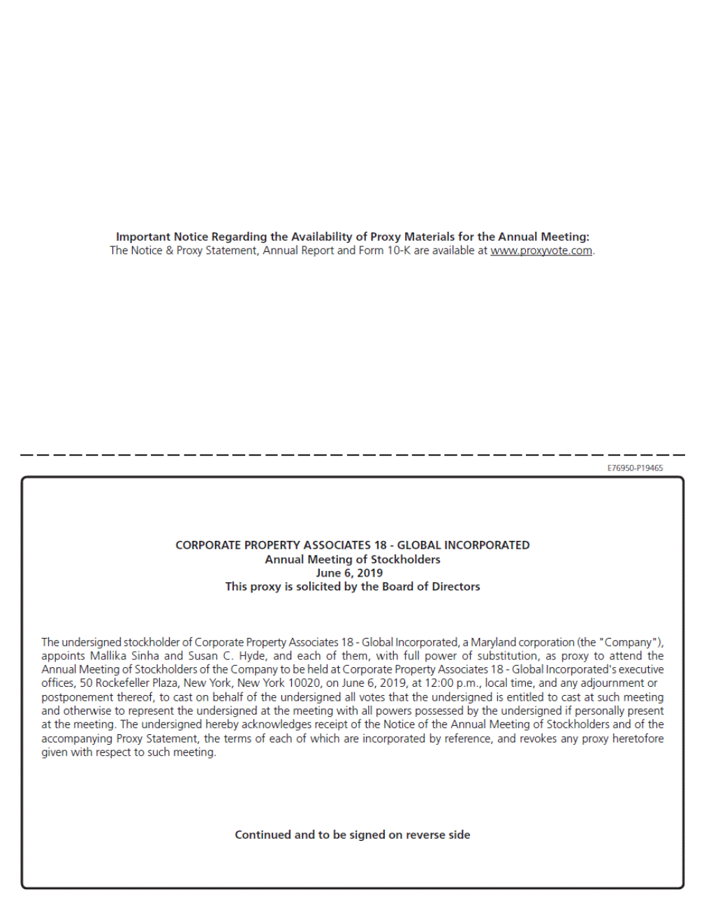 Important Notice Regarding the Availability of Proxy Materials for the Annual Meeting: The Notice & Proxy Statement, Annual Report and Form 10-K are available at www.proxyvote.com. E76950-P19465 CORPORATE PROPERTY ASSOCIATES 18 - GLOBAL INCORPORATED Annual Meeting of Stockholders June 12, 2019 This proxy is solicited by the Board of Directors The undersigned stockholder of Corporate Property Associates 18 - Global Incorporated, a Maryland corporation (the "Company"), appoints Mallika Sinha and Susan C. Hyde, and each of them, with full power of substitution, as proxy to attend the Annual Meeting of Stockholders of the Company to be held at Corporate Property Associates 18 - Global Incorporated's executive offices, 50 Rockefeller Plaza, New York, New York 10020, on June 12, 2019, at 12:00 p.m., local time, and any adjournment or postponement thereof, to cast on behalf of the undersigned all votes that the undersigned is entitled to cast at such meeting and otherwise to represent the undersigned at the meeting with all powers possessed by the undersigned if personally present at the meeting. The undersigned hereby acknowledges receipt of the Notice of the Annual Meeting of Stockholders and of the accompanying Proxy Statement, the terms of each of which are incorporated by reference, and revokes any proxy heretofore given with respect to such meeting. Continued and to be signed on reverse side