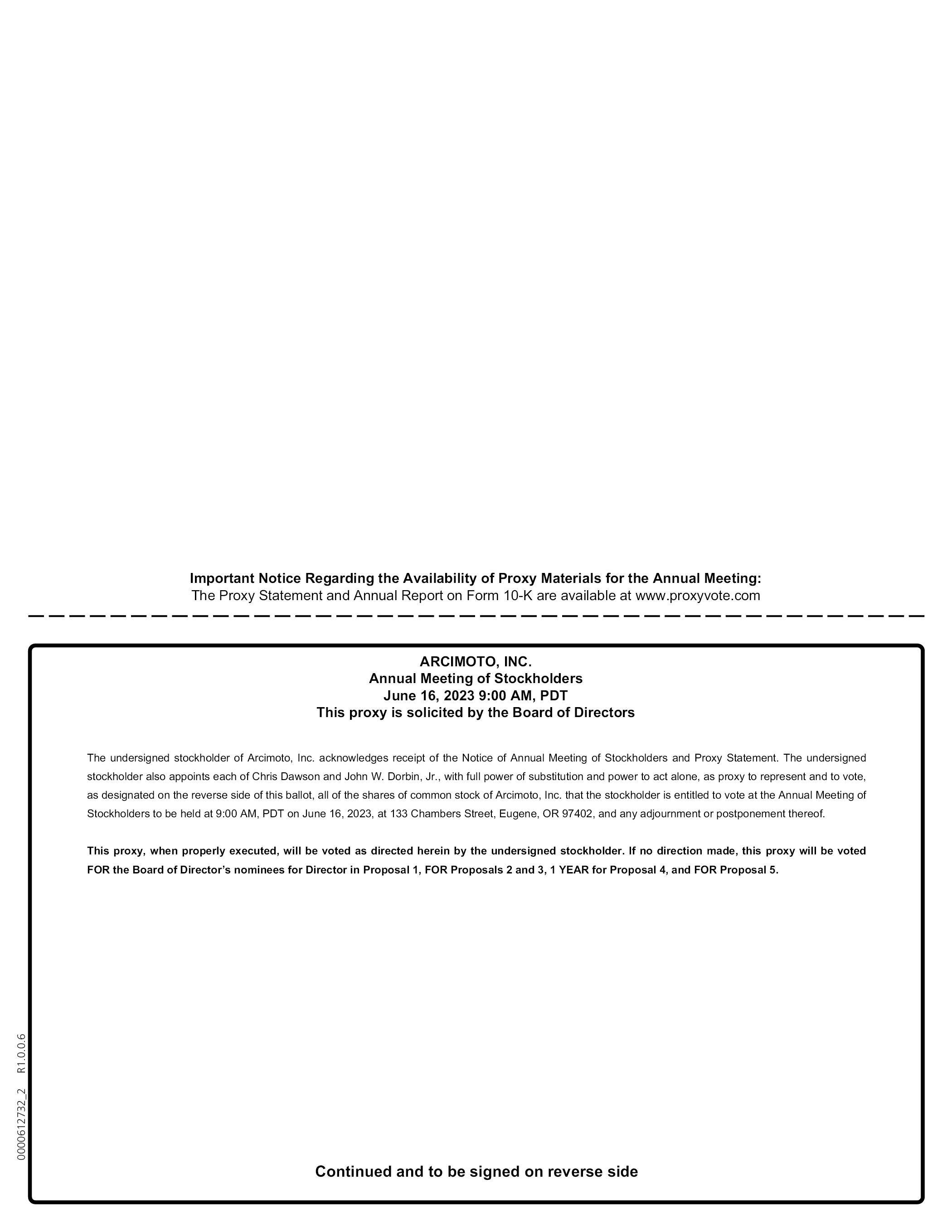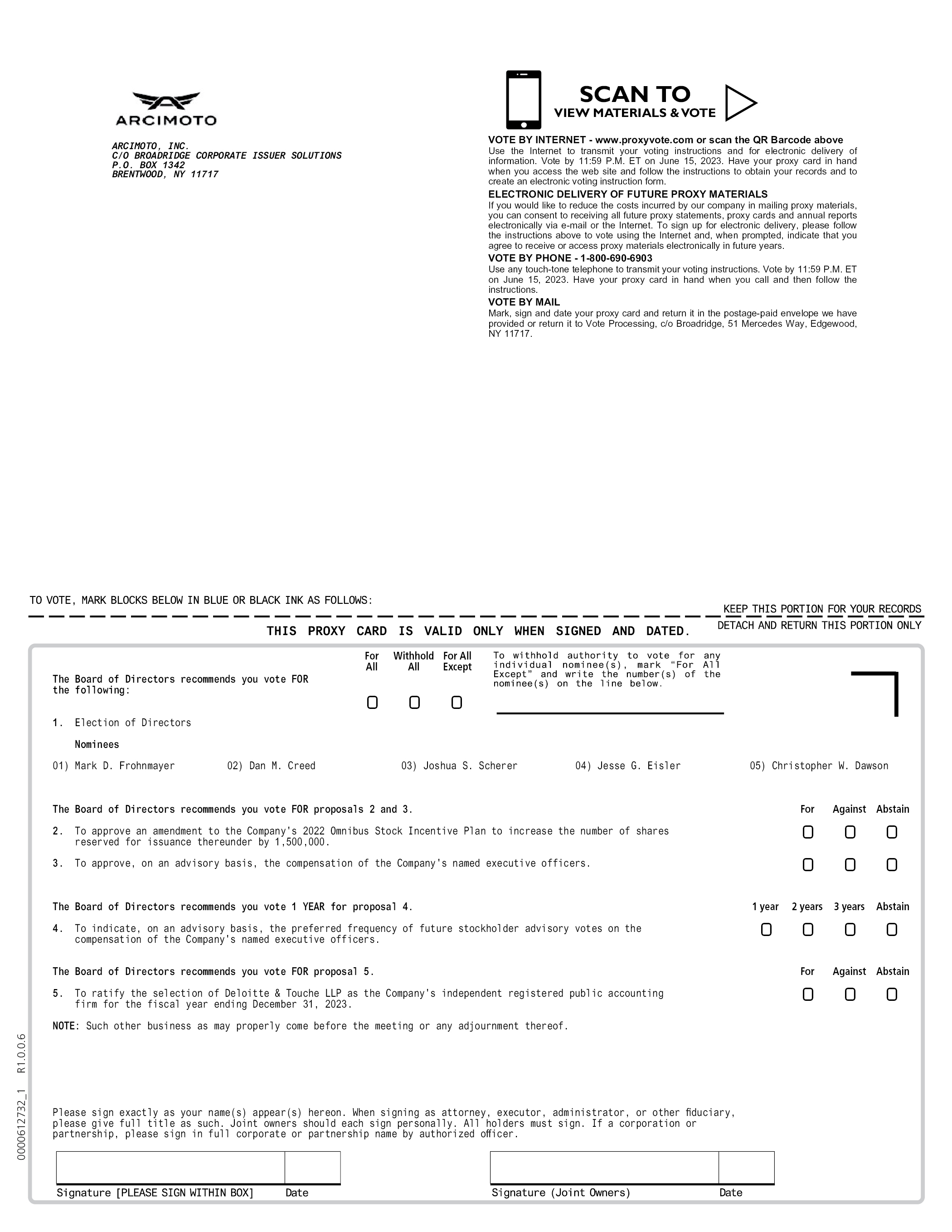 ARCIMOTO, INC. C/O BROADRIDGE CORPORATE ISSUER SOLUTIONS P.O. BOX 1342 BRENTWOOD, NY 11717 VOTE BY INTERNET - www.proxyvote.com or scan the QR Barcode above Use the Internet to transmit your voting instructions and for electronic delivery of information. Vote by 11:59 P.M. ET on June 15, 2023. Have your proxy card in hand when you access the web site and follow the instructions to obtain your records and to create an electronic voting instruction form. ELECTRONIC DELIVERY OF FUTURE PROXY MATERIALS If you would like to reduce the costs incurred by our company in mailing proxy materials, you can consent to receiving all future proxy statements, proxy cards and annual reports electronically via e-mail or the Internet. To sign up for electronic delivery, please follow the instructions above to vote using the Internet and, when prompted, indicate that you agree to receive or access proxy materials electronically in future years. VOTE BY PHONE - 1-800-690-6903 Use any touch-tone telephone to transmit your voting instructions. Vote by 11:59 P.M. ET on June 15, 2023. Have your proxy card in hand when you call and then follow the instructions. VOTE BY MAIL Mark, sign and date your proxy card and return it in the postage-paid envelope we have provided or return it to Vote Processing, c/o Broadridge, 51 Mercedes Way, Edgewood, NY 11717. TO VOTE, MARK BLOCKS BELOW IN BLUE OR BLACK INK AS FOLLOWS: KEEP THIS PORTION FOR YOUR RECORDS DETACH AND RETURN THIS PORTION ONLY THIS PROXY CARD IS VALID ONLY WHEN SIGNED AND DATED. For Withhold For All All All Except To withhold authority to vote for any individual nominee(s), mark “For All Except” and write the number(s) of the nominee(s) on the line below. The Board of Directors recommends you vote FOR the following: 1. Election of Directors 2. Nominees 3. 01) Mark D. Frohnmayer 4. 02) Dan M. Creed 5. 03) Joshua S. Scherer 6. 04) Jesse G. Eisler 7. 05) Christopher W. Dawson The Board of Directors recommends you vote FOR proposals 2 and 3. 2. To approve an amendment to the Company’s 2022 Omnibus Stock Incentive Plan to increase the number of shares reserved for issuance thereunder by 1,500,000. 3. To approve, on an advisory basis, the compensation of the Company’s named executive officers. For Against Abstain The Board of Directors recommends you vote 1 YEAR for proposal 4. 1 year 2 years 3 years Abstain 4. To indicate, on an advisory basis, the preferred frequency of future stockholder advisory votes on the compensation of the Company’s named executive officers. The Board of Directors recommends you vote FOR proposal 5. For Against Abstain 5. To ratify the selection of Deloitte & Touche LLP as the Company’s independent registered public accounting firm for the fiscal year ending December 31, 2023. NOTE: Such other business as may properly come before the meeting or any adjournment thereof. Please sign exactly as your name(s) appear(s) hereon. When signing as attorney, executor, administrator, or other fiduciary, please give full title as such. Joint owners should each sign personally. All holders must sign. If a corporation or partnership, please sign in full corporate or partnership name by authorized officer. Signature [PLEASE SIGN WITHIN BOX] Date Signature (Joint Owners) Date