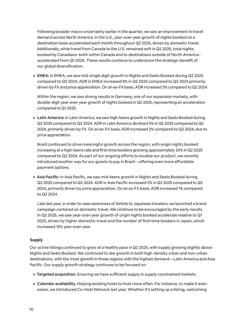 Following broader macro uncertainty earlier in the quarter, we saw an improvement in travel demand across North America. In the U.S., year-over-year growth of nights booked on a destination basis accelerated each month throughout Q2 2025, driven by domestic travel. Additionally, while travel from Canada to the U.S. remained soft in Q2 2025, total nights booked by Canadians–both within Canada and to destinations outside of North America– accelerated from Q1 2025. These results continue to underscore the strategic benefit of our global diversification. ¦ EMEA: In EMEA, we saw mid-single digit growth in Nights and Seats Booked during Q2 2025 compared to Q2 2024. ADR in EMEA increased 9% in Q2 2025 compared to Q2 2024 primarily driven by FX and price appreciation. On an ex-FX basis, ADR increased 3% compared to Q2 2024. Within the region, we saw strong results in Germany, one of our expansion markets, with double-digit year-over-year growth of nights booked in Q2 2025, representing an acceleration compared to Q1 2025. ¦ Latin America: In Latin America, we saw high-teens growth in Nights and Seats Booked during Q2 2025 compared to Q2 2024. ADR in Latin America declined 3% in Q2 2025 compared to Q2 2024, primarily driven by FX. On an ex-FX basis, ADR increased 2% compared to Q2 2024, due to price appreciation. Brazil continued to drive meaningful growth across the region, with origin nights booked increasing at a high-teens rate and first-time bookers growing approximately 20% in Q2 2025 compared to Q2 2024. As part of our ongoing eo ff rts to localize our product, we recently introduced another way for our guests to pay in Brazil—offering even more ao ff rdable payment options. ¦ Asia Pacific: In Asia Pacific, we saw mid-teens growth in Nights and Seats Booked during Q2 2025 compared to Q2 2024. ADR in Asia Pacific increased 2% in Q2 2025 compared to Q2 2024, primarily driven by price appreciation. On an ex-FX basis, ADR increased 1% compared to Q2 2024. Late last year, in order to raise awareness of Airbnb to Japanese travelers, we launched a brand campaign centered on domestic travel. We continue to be encouraged by the early results. In Q2 2025, we saw year-over-year growth of origin nights booked accelerate relative to Q1 2025, driven by higher domestic travel and the number of first-time bookers in Japan, which increased 15% year-over-year. Supply Our active listings continued to grow at a healthy pace in Q2 2025, with supply growing slightly above Nights and Seats Booked. We continued to see growth in both high-density urban and non-urban destinations, with the most growth in those regions with the highest demand—Latin America and Asia Pacific. Our supply growth strategy continues to be focused on: ¦ Targeted acquisition. Ensuring we have sufficient supply in supply constrained markets. ¦ Calendar availability. Helping existing hosts to host more often. For instance, to make it even easier, we introduced Co-Host Network last year. Whether it’s setting up a listing, welcoming 10