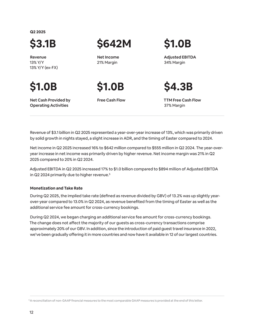 Q2 2025 $3.1B $642M $1.0B Revenue Net Income Adjusted EBITDA 13% Y/Y 21% Margin 34% Margin 13% Y/Y (ex-FX) $1.0B $1.0B $4.3B Net Cash Provided by Free Cash Flow TTM Free Cash Flow Operating Activities 37% Margin Revenue of $3.1 billion in Q2 2025 represented a year-over-year increase of 13%, which was primarily driven by solid growth in nights stayed, a slight increase in ADR, and the timing of Easter compared to 2024. Net income in Q2 2025 increased 16% to $642 million compared to $555 million in Q2 2024. The year-over- year increase in net income was primarily driven by higher revenue. Net income margin was 21% in Q2 2025 compared to 20% in Q2 2024. Adjusted EBITDA in Q2 2025 increased 17% to $1.0 billion compared to $894 million of Adjusted EBITDA 5 in Q2 2024 primarily due to higher revenue. Monetization and Take Rate During Q2 2025, the implied take rate (defined as revenue divided by GBV) of 13.2% was up slightly year- over-year compared to 13.0% in Q2 2024, as revenue benefited from the timing of Easter as well as the additional service fee amount for cross-currency bookings. During Q2 2024, we began charging an additional service fee amount for cross-currency bookings. The change does not affect the majority of our guests as cross-currency transactions comprise approximately 20% of our GBV. In addition, since the introduction of paid guest travel insurance in 2022, we’ve been gradually offering it in more countries and now have it available in 12 of our largest countries. 5 A reconciliation of non-GAAP financial measures to the most comparable GAAP measures is provided at the end of this letter. 12