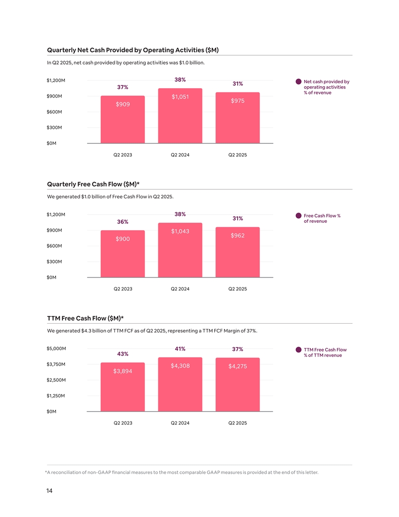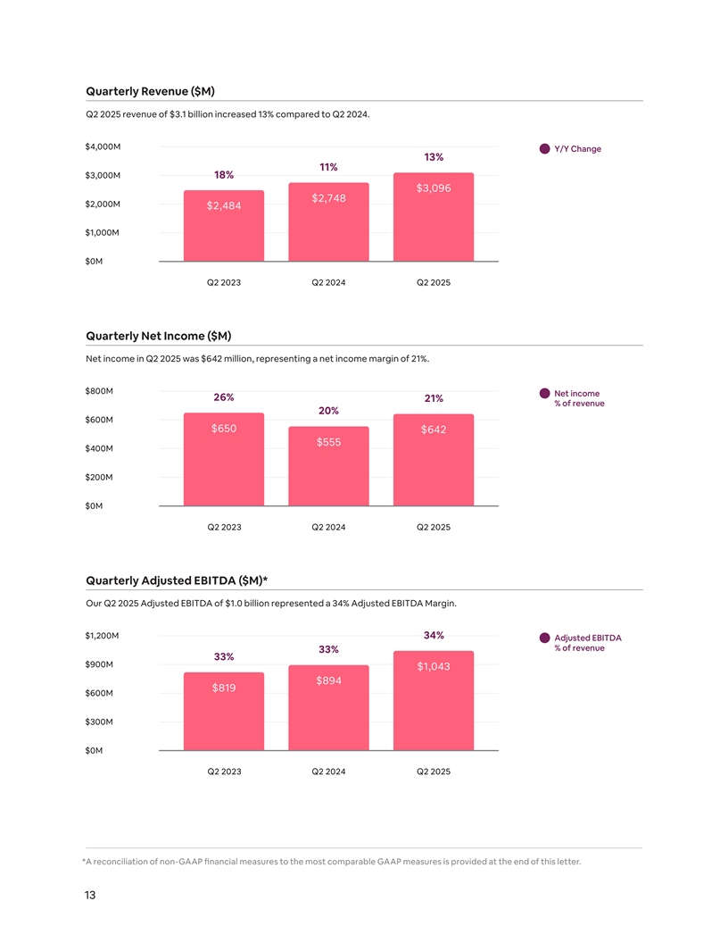 Quarterly Revenue ($M) Q2 2025 revenue of $3.1 billion increased 13% compared to Q2 2024. $4,000M Y/Y Change 13% 11% $3,000M 18% $3,096 $2,748 $2,000M $2,484 $1,000M $0M Q2 2023 Q2 2024 Q2 2025 Quarterly Net Income ($M) Net income in Q2 2025 was $642 million, representing a net income margin of 21%. $800M Net income 26% 21% % of revenue 20% $600M $650 $642 $555 $400M $200M $0M Q2 2023 Q2 2024 Q2 2025 Quarterly Adjusted EBITDA ($M)* Our Q2 2025 Adjusted EBITDA of $1.0 billion represented a 34% Adjusted EBITDA Margin. $1,200M 34% Adjusted EBITDA % of revenue 33% 33% $900M $1,043 $894 $819 $600M $300M $0M Q2 2023 Q2 2024 Q2 2025 *A reconciliation of non-GAAP financial measures to the most comparable GAAP measures is provided at the end of this letter. 13