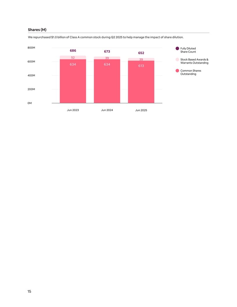 Shares (M) We repurchased $1.0 billion of Class A common stock during Q2 2025 to help manage the impact of share dilution. 800M Fully Diluted 686 673 Share Count 652 52 39 39 Stock Based Awards & 600M Warrants Outstanding 634 634 613 Common Shares Outstanding 400M 200M 0M Jun 2023 Jun 2024 Jun 2025 15