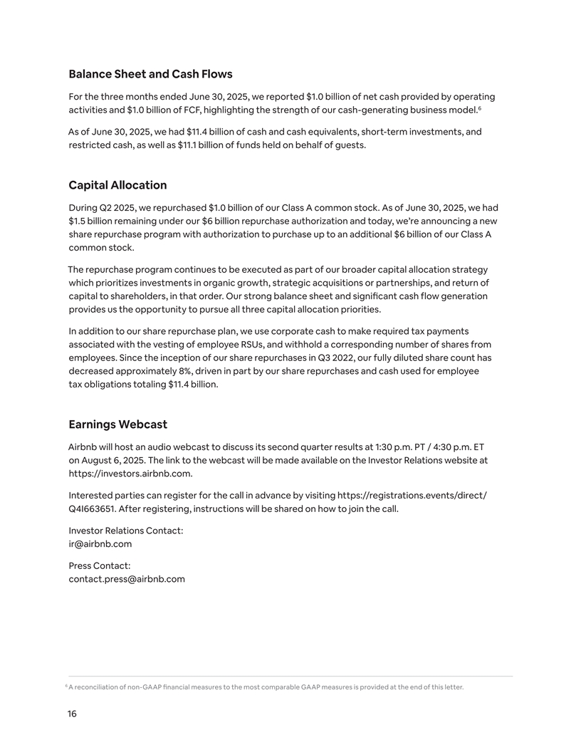 Balance Sheet and Cash Flows For the three months ended June 30, 2025, we reported $1.0 billion of net cash provided by operating 6 activities and $1.0 billion of FCF, highlighting the strength of our cash-generating business model. As of June 30, 2025, we had $11.4 billion of cash and cash equivalents, short-term investments, and restricted cash, as well as $11.1 billion of funds held on behalf of guests. Capital Allocation During Q2 2025, we repurchased $1.0 billion of our Class A common stock. As of June 30, 2025, we had $1.5 billion remaining under our $6 billion repurchase authorization and today, we’re announcing a new share repurchase program with authorization to purchase up to an additional $6 billion of our Class A common stock. The repurchase program continues to be executed as part of our broader capital allocation strategy which prioritizes investments in organic growth, strategic acquisitions or partnerships, and return of capital to shareholders, in that order. Our strong balance sheet and significant cash flow generation provides us the opportunity to pursue all three capital allocation priorities. In addition to our share repurchase plan, we use corporate cash to make required tax payments associated with the vesting of employee RSUs, and withhold a corresponding number of shares from employees. Since the inception of our share repurchases in Q3 2022, our fully diluted share count has decreased approximately 8%, driven in part by our share repurchases and cash used for employee tax obligations totaling $11.4 billion. Earnings Webcast Airbnb will host an audio webcast to discuss its second quarter results at 1:30 p.m. PT / 4:30 p.m. ET on August 6, 2025. The link to the webcast will be made available on the Investor Relations website at https://investors.airbnb.com. Interested parties can register for the call in advance by visiting https://registrations.events/direct/ Q4I663651. After registering, instructions will be shared on how to join the call. Investor Relations Contact: ir@airbnb.com Press Contact: contact.press@airbnb.com 6 A reconciliation of non-GAAP financial measures to the most comparable GAAP measures is provided at the end of this letter. 16