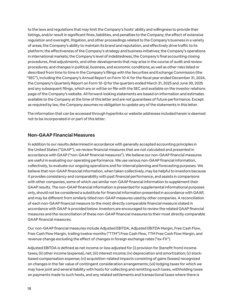 to the laws and regulations that may limit the Company’s hosts’ ability and willingness to provide their listings, and/or result in significant fines, liabilities, and penalties to the Company; the effect of extensive regulation and oversight, litigation, and other proceedings related to the Company’s business in a variety of areas; the Company’s ability to maintain its brand and reputation, and effectively drive traffic to its platform; the ee ff ctiveness of the Company’s strategy and business initiatives; the Company’s operations in international markets; the Company’s level of indebtedness; the Company’s final accounting closing procedures, final adjustments, and other developments that may arise in the course of audit and review procedures; and changes in political, business, and economic conditions; as well as other risks listed or described from time to time in the Company’s filings with the Securities and Exchange Commission (the “SEC”), including the Company’s Annual Report on Form 10-K for the fiscal year ended December 31, 2024, the Company’s Quarterly Report on Form 10-Q for the quarters ended March 31, 2025 and June 30, 2025 and any subsequent filings, which are or will be on file with the SEC and available on the investor relations page of the Company’s website. All forward-looking statements are based on information and estimates available to the Company at the time of this letter and are not guarantees of future performance. Except as required by law, the Company assumes no obligation to update any of the statements in this letter. The information that can be accessed through hyperlinks or website addresses included herein is deemed not to be incorporated in or part of this letter. Non-GAAP Financial Measures In addition to our results determined in accordance with generally accepted accounting principles in the United States (“GAAP”), we review financial measures that are not calculated and presented in accordance with GAAP (“non-GAAP financial measures”). We believe our non-GAAP financial measures are useful in evaluating our operating performance. We use various non-GAAP financial information, collectively, to evaluate our ongoing operations and for internal planning and forecasting purposes. We believe that non-GAAP financial information, when taken collectively, may be helpful to investors because it provides consistency and comparability with past financial performance, and assists in comparisons with other companies, some of which use similar non-GAAP financial information to supplement their GAAP results. The non-GAAP financial information is presented for supplemental informational purposes only, should not be considered a substitute for financial information presented in accordance with GAAP, and may be different from similarly titled non-GAAP measures used by other companies. A reconciliation of each non-GAAP financial measure to the most directly comparable financial measure stated in accordance with GAAP is provided below. Investors are encouraged to review the related GAAP financial measures and the reconciliation of these non-GAAP financial measures to their most directly comparable GAAP financial measures. Our non-GAAP financial measures include Adjusted EBITDA, Adjusted EBITDA Margin, Free Cash Flow, Free Cash Flow Margin, trailing twelve months (“TTM”) Free Cash Flow, TTM Free Cash Flow Margin, and revenue change excluding the effect of changes in foreign exchange rates (“ex-FX”). Adjusted EBITDA is defined as net income or loss adjusted for (i) provision for (benefit from) income taxes; (ii) other income (expense), net; (iii) interest income; (iv) depreciation and amortization; (v) stock- based compensation expense; (vi) acquisition-related impacts consisting of gains (losses) recognized on changes in the fair value of contingent consideration arrangements; (vii) lodging taxes for which we may have joint and several liability with hosts for collecting and remitting such taxes, withholding taxes on payments made to such hosts, and any related settlements and transactional taxes where there is 18
