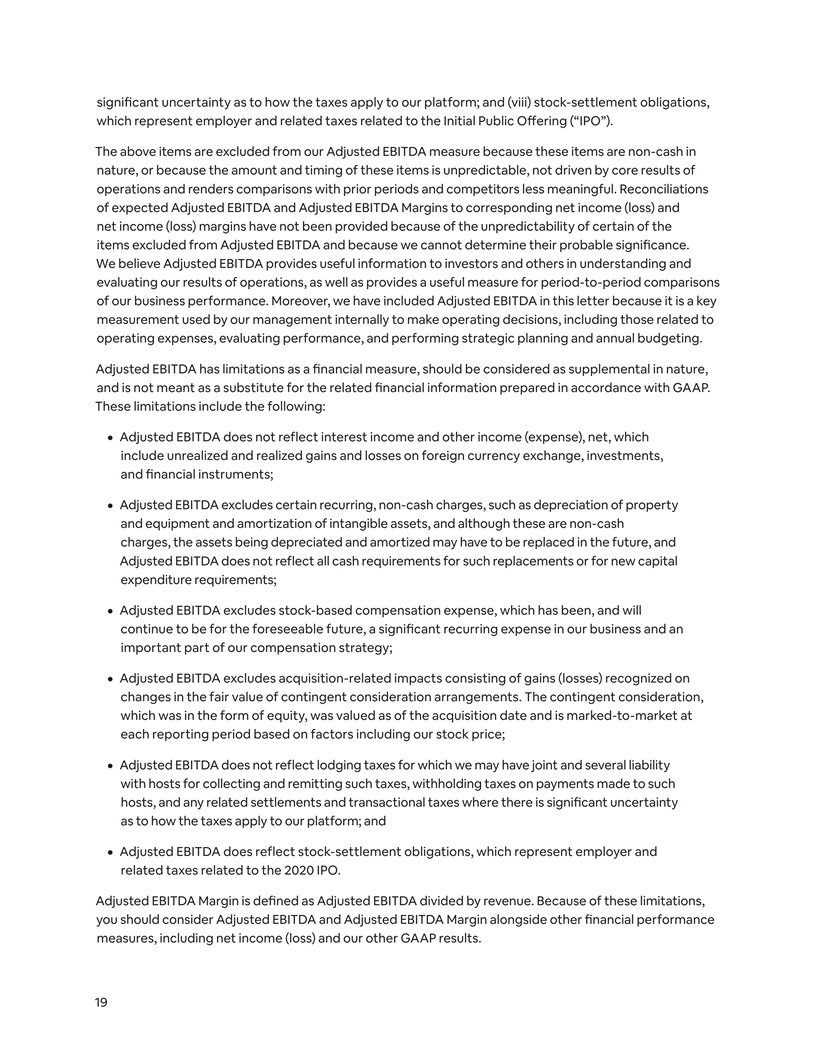 significant uncertainty as to how the taxes apply to our platform; and (viii) stock-settlement obligations, which represent employer and related taxes related to the Initial Public Offering (“IPO”). The above items are excluded from our Adjusted EBITDA measure because these items are non-cash in nature, or because the amount and timing of these items is unpredictable, not driven by core results of operations and renders comparisons with prior periods and competitors less meaningful. Reconciliations of expected Adjusted EBITDA and Adjusted EBITDA Margins to corresponding net income (loss) and net income (loss) margins have not been provided because of the unpredictability of certain of the items excluded from Adjusted EBITDA and because we cannot determine their probable significance. We believe Adjusted EBITDA provides useful information to investors and others in understanding and evaluating our results of operations, as well as provides a useful measure for period-to-period comparisons of our business performance. Moreover, we have included Adjusted EBITDA in this letter because it is a key measurement used by our management internally to make operating decisions, including those related to operating expenses, evaluating performance, and performing strategic planning and annual budgeting. Adjusted EBITDA has limitations as a financial measure, should be considered as supplemental in nature, and is not meant as a substitute for the related financial information prepared in accordance with GAAP. These limitations include the following: ¦ Adjusted EBITDA does not reflect interest income and other income (expense), net, which include unrealized and realized gains and losses on foreign currency exchange, investments, and financial instruments; ¦ Adjusted EBITDA excludes certain recurring, non-cash charges, such as depreciation of property and equipment and amortization of intangible assets, and although these are non-cash charges, the assets being depreciated and amortized may have to be replaced in the future, and Adjusted EBITDA does not reflect all cash requirements for such replacements or for new capital expenditure requirements; ¦ Adjusted EBITDA excludes stock-based compensation expense, which has been, and will continue to be for the foreseeable future, a significant recurring expense in our business and an important part of our compensation strategy; ¦ Adjusted EBITDA excludes acquisition-related impacts consisting of gains (losses) recognized on changes in the fair value of contingent consideration arrangements. The contingent consideration, which was in the form of equity, was valued as of the acquisition date and is marked-to-market at each reporting period based on factors including our stock price; ¦ Adjusted EBITDA does not reflect lodging taxes for which we may have joint and several liability with hosts for collecting and remitting such taxes, withholding taxes on payments made to such hosts, and any related settlements and transactional taxes where there is significant uncertainty as to how the taxes apply to our platform; and ¦ Adjusted EBITDA does reflect stock-settlement obligations, which represent employer and related taxes related to the 2020 IPO. Adjusted EBITDA Margin is defined as Adjusted EBITDA divided by revenue. Because of these limitations, you should consider Adjusted EBITDA and Adjusted EBITDA Margin alongside other financial performance measures, including net income (loss) and our other GAAP results. 19