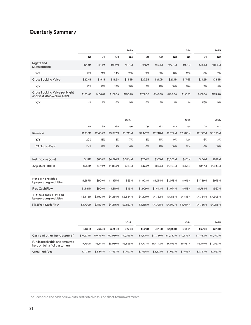 Quarterly Summary 2023 2024 2025 Q1 Q2 Q3 Q4 Q1 Q2 Q3 Q4 Q1 Q2 Nights and 121.1M 115.1M 113.2M 98.8M 132.6M 125.1M 122.8M 111.0M 143.1M 134.4M Seats Booked 19% 11% 14% 12% 9% 9% 8% 12% 8% 7% Y/Y $20.4B $19.1B $18.3B $15.5B $22.9B $21.2B $20.1B $17.6B $24.5B $23.5B Gross Booking Value 19% 13% 17% 15% 12% 11% 10% 13% 7% 11% Y/Y Gross Booking Value per Night $168.43 $166.01 $161.38 $156.73 $172.88 $169.53 $163.64 $158.13 $171.34 $174.48 and Seats Booked (or ADR) Y/Y -% 1% 3% 3% 3% 2% 1% 1% (1)% 3% 2023 2024 2025 Q1 Q2 Q3 Q4 Q1 Q2 Q3 Q4 Q1 Q2 Revenue $1,818M $2,484M $3,397M $2,218M $2,142M $2,748M $3,732M $2,480M $2,272M $3,096M Y/Y 20% 18% 18% 17% 18% 11% 10% 12% 6% 13% FX Neutral Y/Y 24% 19% 14% 14% 18% 11% 10% 12% 8% 13% Net income (loss) $117M $650M $4,374M $(349)M $264M $555M $1,368M $461M $154M $642M Adjusted EBITDA $262M $819M $1,834M $738M $424M $894M $1,958M $765M $417M $1,043M Net cash provided $1,587M $909M $1,325M $63M $1,923M $1,051M $1,078M $466M $1,789M $975M by operating activities Free Cash Flow $1,581M $900M $1,310M $46M $1,909M $1,043M $1,074M $458M $1,781M $962M TTM Net cash provided $3,815M $3,923M $4,284M $3,884M $4,220M $4,362M $4,115M $4,518M $4,384M $4,308M by operating activities $3,790M $3,894M $4,246M $3,837M $4,165M $4,308M $4,072M $4,484M $4,356M $4,275M TTM Free Cash Flow 2023 2024 2025 Mar 31 Jun 30 Sept 30 Dec 31 Mar 31 Jun 30 Sept 30 Dec 31 Mar 31 Jun 30 $10,624M $10,369M $10,986M $10,095M $11,128M $11,286M $11,280M $10,636M $11,532M $11,400M Cash and other liquid assets (1) Funds receivable and amounts $7,760M $9,144M $5,986M $5,869M $8,737M $10,342M $6,573M $5,931M $9,175M $11,067M held on behalf of customers $2,172M $2,347M $1,467M $1,427M $2,434M $2,621M $1,657M $1,616M $2,723M $2,857M Unearned fees 1 Includes cash and cash equivalents, restricted cash, and short-term investments. 21