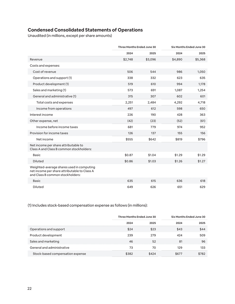 Condensed Consolidated Statements of Operations Unaudited (in millions, except per share amounts) Three Months Ended June 30 Six Months Ended June 30 2024 2025 2024 2025 Revenue $2,748 $3,096 $4,890 $5,368 Costs and expenses: Cost of revenue 506 544 986 1,050 Operations and support (1) 338 332 623 635 Product development (1) 519 610 994 1,178 Sales and marketing (1) 573 691 1,087 1,254 General and administrative (1) 315 307 602 601 Total costs and expenses 2,251 2,484 4,292 4,718 Income from operations 497 612 598 650 Interest income 226 190 428 363 Other expense, net (42) (23) (52) (61) Income before income taxes 681 779 974 952 Provision for income taxes 126 137 155 156 Net income $555 $642 $819 $796 Net income per share attributable to Class A and Class B common stockholders: Basic $0.87 $1.04 $1.29 $1.29 Diluted $0.86 $1.03 $1.26 $1.27 Weighted-average shares used in computing net income per share attributable to Class A and Class B common stockholders: Basic 635 615 636 618 Diluted 649 626 651 629 (1) Includes stock-based compensation expense as follows (in millions): Three Months Ended June 30 Six Months Ended June 30 2024 2025 2024 2025 Operations and support $24 $23 $43 $44 Product development 239 279 424 509 Sales and marketing 46 52 81 96 General and administrative 73 70 129 133 Stock-based compensation expense $382 $424 $677 $782 22