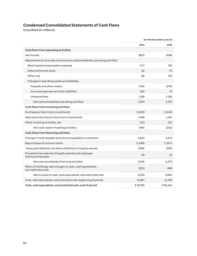 Condensed Consolidated Statements of Cash Flows Unaudited (in millions) Six Months Ended June 30 2024 2025 Cash flows from operating activities: Net income $819 $796 Adjustments to reconcile net income to cash provided by operating activities: Stock-based compensation expense 677 782 Deferred income taxes 65 70 Other, net 89 145 Changes in operating assets and liabilities: Prepaids and other assets (105) (275) Accrued expenses and other liabilities 230 10 Unearned fees 1,199 1,236 Net cash provided by operating activities 2,974 2,764 Cash flows from investing activities: Purchases of short-term investments (1,520) (1,643) Sales and maturities of short-term investments 1,348 1,432 Other investing activities, net (22) (31) Net cash used in investing activities (194) (242) Cash flows from financing activities: Change in funds payable and amounts payable to customers 4,654 4,510 Repurchases of common stock (1,499) (1,817) Taxes paid related to net share settlement of equity awards (309) (295) Proceeds from exercise of equity awards and employee 99 75 stock purchase plan Net cash provided by financing activities 2,945 2,473 Effect of exchange rate changes on cash, cash equivalents, (202) 689 and restricted cash Net increase in cash, cash equivalents, and restricted cash 5,523 5,684 Cash, cash equivalents, and restricted cash, beginning of period 12,667 12,760 Cash, cash equivalents, and restricted cash, end of period $ 18,190 $ 18,444 24