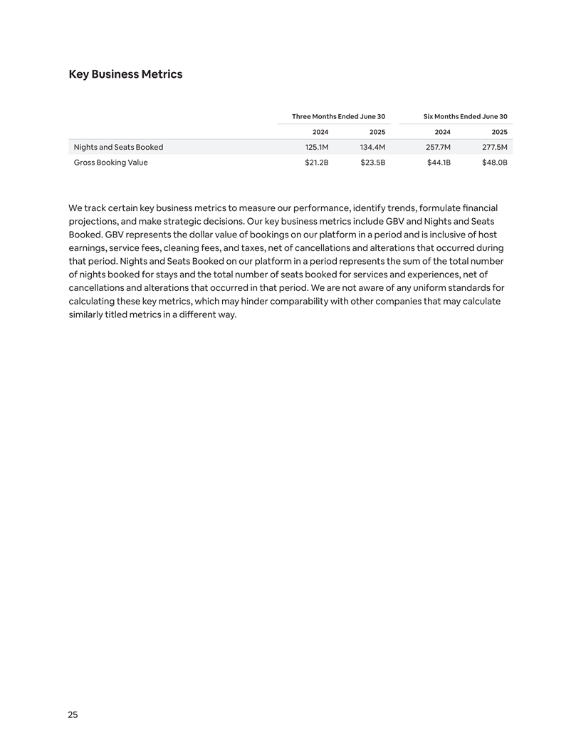 Key Business Metrics Three Months Ended June 30 Six Months Ended June 30 2024 2025 2024 2025 Nights and Seats Booked 125.1M 134.4M 257.7M 277.5M Gross Booking Value $21.2B $23.5B $44.1B $48.0B We track certain key business metrics to measure our performance, identify trends, formulate financial projections, and make strategic decisions. Our key business metrics include GBV and Nights and Seats Booked. GBV represents the dollar value of bookings on our platform in a period and is inclusive of host earnings, service fees, cleaning fees, and taxes, net of cancellations and alterations that occurred during that period. Nights and Seats Booked on our platform in a period represents the sum of the total number of nights booked for stays and the total number of seats booked for services and experiences, net of cancellations and alterations that occurred in that period. We are not aware of any uniform standards for calculating these key metrics, which may hinder comparability with other companies that may calculate similarly titled metrics in a different way. 25
