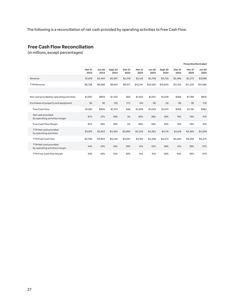 The following is a reconciliation of net cash provided by operating activities to Free Cash Flow. Free Cash Flow Reconciliation (in millions, except percentages) Three Months Ended Mar 31 Jun 30 Sept 30 Dec 31 Mar 31 Jun 30 Sept 30 Dec 31 Mar 31 Jun 30 2023 2023 2023 2023 2024 2024 2024 2024 2025 2025 Revenue $1,818 $2,484 $3,397 $2,218 $2,142 $2,748 $3,732 $2,480 $2,272 $3,096 TTM Revenue $8,708 $9,088 $9,601 $9,917 $10,241 $10,505 $10,840 $11,102 $11,232 $11,580 Net cash provided by operating activities $1,587 $909 $1,325 $63 $1,923 $1,051 $1,078 $466 $1,789 $975 Purchases of property and equipment (6) (9) (15) (17) (14) (8) (4) (8) (8) (13) Free Cash Flow $1,581 $900 $1,310 $46 $1,909 $1,043 $1,074 $458 $1,781 $962 Net cash provided 87% 37% 39% 3% 90% 38% 29% 19% 79% 31% by operating activities margin Free Cash Flow Margin 87% 36% 39% 2% 89% 38% 29% 18% 78% 31% TTM Net cash provided $3,815 $3,923 $4,284 $3,884 $4,220 $4,362 $4,115 $4,518 $4,384 $4,308 by operating activities TTM Free Cash Flow $3,790 $3,894 $4,246 $3,837 $4,165 $4,308 $4,072 $4,484 $4,356 $4,275 TTM Net cash provided 44% 43% 45% 39% 41% 42% 38% 41% 39% 37% by operating activities margin TTM Free Cash Flow Margin 44% 43% 44% 39% 41% 41% 38% 40% 39% 37% 27