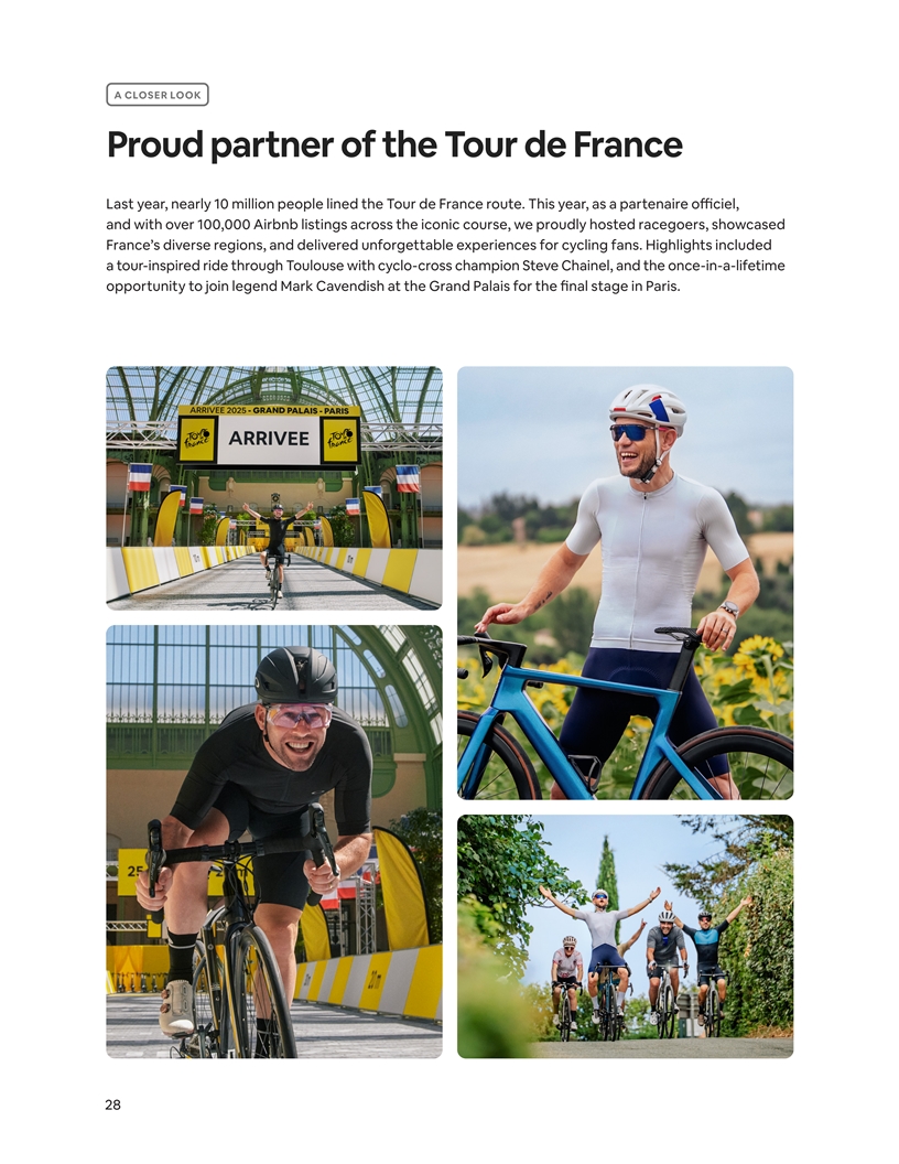 A CLOSER LOOK Proud partner of the Tour de France Last year, nearly 10 million people lined the Tour de France route. This year, as a partenaire officiel, and with over 100,000 Airbnb listings across the iconic course, we proudly hosted racegoers, showcased France’s diverse regions, and delivered unforgettable experiences for cycling fans. Highlights included a tour-inspired ride through Toulouse with cyclo-cross champion Steve Chainel, and the once-in-a-lifetime opportunity to join legend Mark Cavendish at the Grand Palais for the final stage in Paris. 28