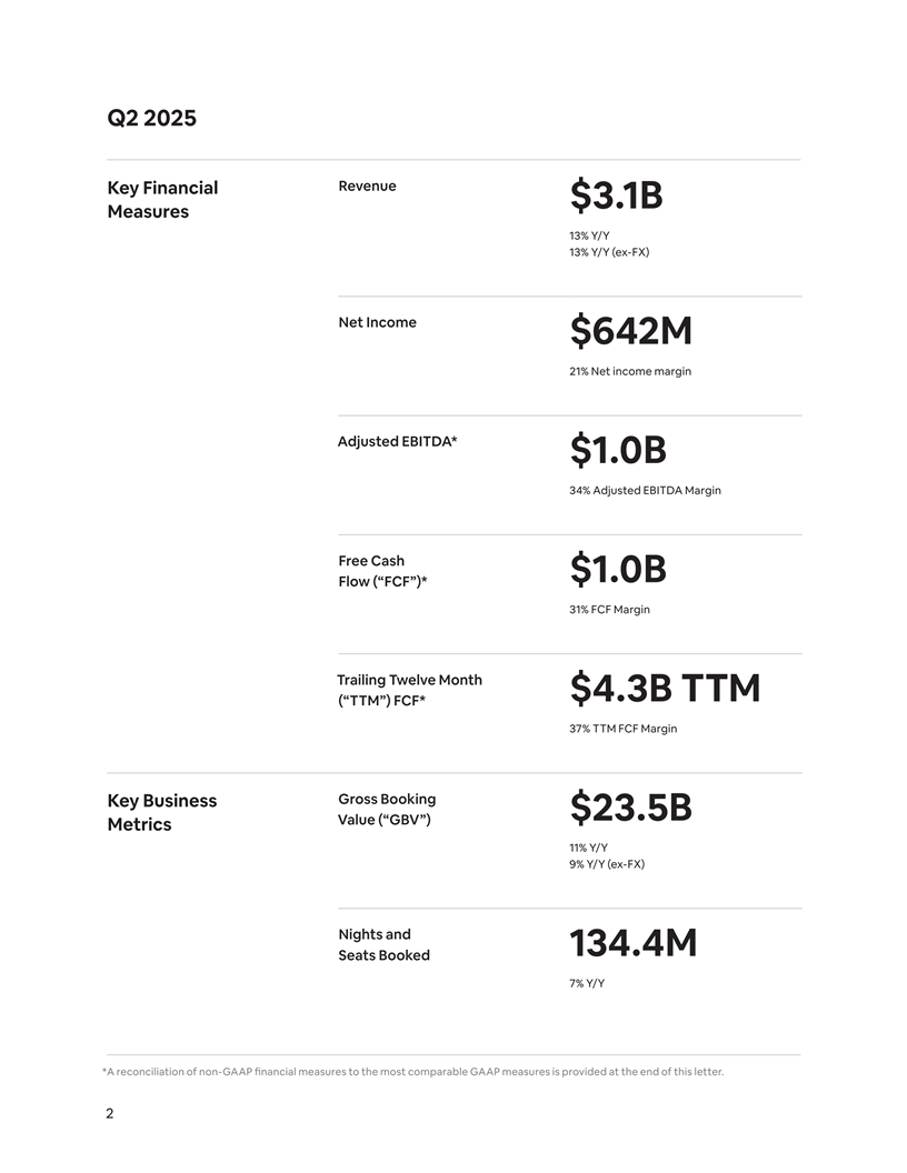 Q2 2025 Revenue Key Financial $3.1B Measures 13% Y/Y 13% Y/Y (ex-FX) Net Income $642M 21% Net income margin Adjusted EBITDA* $1.0B 34% Adjusted EBITDA Margin Free Cash $1.0B Flow (“FCF”)* 31% FCF Margin Trailing Twelve Month $4.3B TTM (“TTM”) FCF* 37% TTM FCF Margin Gross Booking Key Business $23.5B Value (“GBV”) Metrics 11% Y/Y 9% Y/Y (ex-FX) Nights and 134.4M Seats Booked 7% Y/Y *A reconciliation of non-GAAP financial measures to the most comparable GAAP measures is provided at the end of this letter. 2