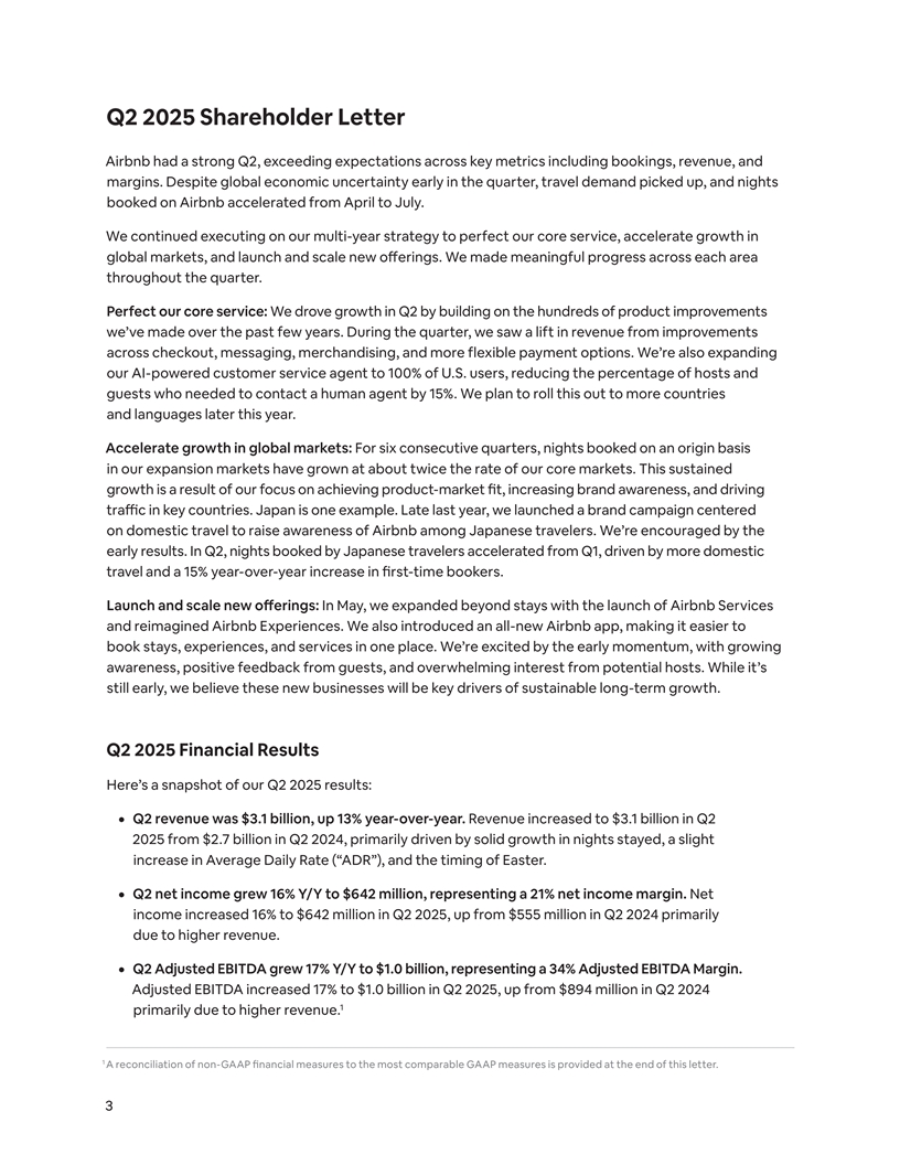 Q2 2025 Shareholder Letter Airbnb had a strong Q2, exceeding expectations across key metrics including bookings, revenue, and margins. Despite global economic uncertainty early in the quarter, travel demand picked up, and nights booked on Airbnb accelerated from April to July. We continued executing on our multi-year strategy to perfect our core service, accelerate growth in global markets, and launch and scale new offerings. We made meaningful progress across each area throughout the quarter. Perfect our core service: We drove growth in Q2 by building on the hundreds of product improvements we’ve made over the past few years. During the quarter, we saw a lift in revenue from improvements across checkout, messaging, merchandising, and more flexible payment options. We’re also expanding our AI-powered customer service agent to 100% of U.S. users, reducing the percentage of hosts and guests who needed to contact a human agent by 15%. We plan to roll this out to more countries and languages later this year. Accelerate growth in global markets: For six consecutive quarters, nights booked on an origin basis in our expansion markets have grown at about twice the rate of our core markets. This sustained growth is a result of our focus on achieving product-market fit, increasing brand awareness, and driving traffic in key countries. Japan is one example. Late last year, we launched a brand campaign centered on domestic travel to raise awareness of Airbnb among Japanese travelers. We’re encouraged by the early results. In Q2, nights booked by Japanese travelers accelerated from Q1, driven by more domestic travel and a 15% year-over-year increase in first-time bookers. Launch and scale new offerings: In May, we expanded beyond stays with the launch of Airbnb Services and reimagined Airbnb Experiences. We also introduced an all-new Airbnb app, making it easier to book stays, experiences, and services in one place. We’re excited by the early momentum, with growing awareness, positive feedback from guests, and overwhelming interest from potential hosts. While it’s still early, we believe these new businesses will be key drivers of sustainable long-term growth. Q2 2025 Financial Results Here’s a snapshot of our Q2 2025 results: ¦ Q2 revenue was $3.1 billion, up 13% year-over-year. Revenue increased to $3.1 billion in Q2 2025 from $2.7 billion in Q2 2024, primarily driven by solid growth in nights stayed, a slight increase in Average Daily Rate (“ADR”), and the timing of Easter. ¦ Q2 net income grew 16% Y/Y to $642 million, representing a 21% net income margin. Net income increased 16% to $642 million in Q2 2025, up from $555 million in Q2 2024 primarily due to higher revenue. ¦ Q2 Adjusted EBITDA grew 17% Y/Y to $1.0 billion, representing a 34% Adjusted EBITDA Margin. Adjusted EBITDA increased 17% to $1.0 billion in Q2 2025, up from $894 million in Q2 2024 1 primarily due to higher revenue. 1 A reconciliation of non-GAAP financial measures to the most comparable GAAP measures is provided at the end of this letter. 3