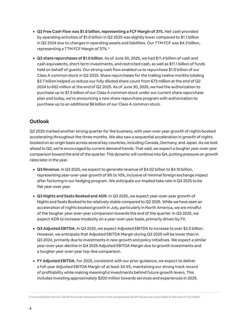 ¦ Q2 Free Cash Flow was $1.0 billion, representing a FCF Margin of 31%. Net cash provided by operating activities of $1.0 billion in Q2 2025 was slightly lower compared to $1.1 billion in Q2 2024 due to changes in operating assets and liabilities. Our TTM FCF was $4.3 billion, 2 representing a TTM FCF Margin of 37%. ¦ Q2 share repurchases of $1.0 billion. As of June 30, 2025, we had $11.4 billion of cash and cash equivalents, short-term investments, and restricted cash, as well as $11.1 billion of funds held on behalf of guests. Our strong cash flow enabled us to repurchase $1.0 billion of our Class A common stock in Q2 2025. Share repurchases for the trailing twelve months totaling $3.7 billion helped us reduce our fully diluted share count from 673 million at the end of Q2 2024 to 652 million at the end of Q2 2025. As of June 30, 2025, we had the authorization to purchase up to $1.5 billion of our Class A common stock under our current share repurchase plan and today, we’re announcing a new share repurchase program with authorization to purchase up to an additional $6 billion of our Class A common stock. Outlook Q2 2025 marked another strong quarter for the business, with year-over-year growth of nights booked accelerating throughout the three months. We also saw a sequential acceleration in growth of nights booked on an origin basis across several key countries, including Canada, Germany, and Japan. As we look ahead to Q3, we’re encouraged by current demand trends. That said, we expect a tougher year-over-year comparison toward the end of the quarter. This dynamic will continue into Q4, putting pressure on growth rates later in the year. ¦ Q3 Revenue. In Q3 2025, we expect to generate revenue of $4.02 billion to $4.10 billion, representing year-over-year growth of 8% to 10%, inclusive of minimal foreign exchange impact after factoring in our hedging program. We anticipate our implied take rate in Q3 2025 to be flat year-over year. ¦ Q3 Nights and Seats Booked and ADR. In Q3 2025, we expect year-over-year growth of Nights and Seats Booked to be relatively stable compared to Q2 2025. While we have seen an acceleration of nights booked growth in July, particularly in North America, we are mindful of the tougher year-over-year comparison towards the end of the quarter. In Q3 2025, we expect ADR to increase modestly on a year-over-year basis, primarily driven by FX. ¦ Q3 Adjusted EBITDA. In Q3 2025, we expect Adjusted EBITDA to increase to over $2.0 billion. However, we anticipate that Adjusted EBITDA Margin during Q3 2025 will be lower than in Q3 2024, primarily due to investments in new growth and policy initiatives. We expect a similar year-over-year decline in Q4 2025 Adjusted EBITDA Margin due to growth investments and a tougher year-over-year top-line comparison. ¦ FY Adjusted EBITDA. For 2025, consistent with our prior guidance, we expect to deliver a full-year Adjusted EBITDA Margin of at least 34.5%, maintaining our strong track record of profitability while making meaningful investments behind future growth levers. This includes investing approximately $200 million towards services and experiences in 2025. 2 A reconciliation of non-GAAP financial measures to the most comparable GAAP measures is provided at the end of this letter. 4