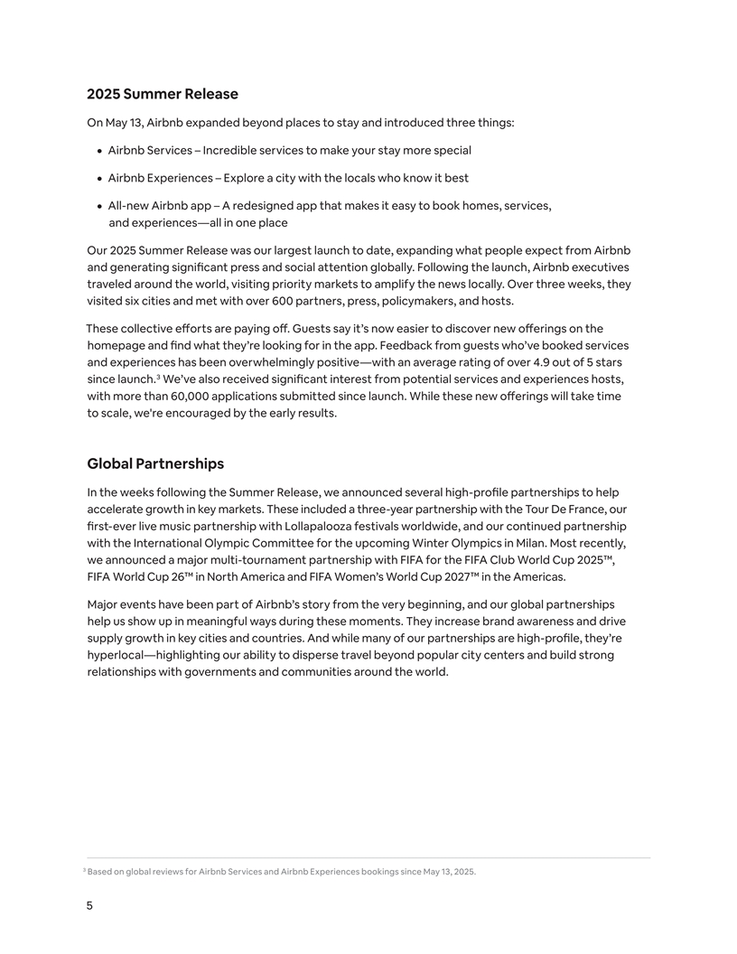 2025 Summer Release On May 13, Airbnb expanded beyond places to stay and introduced three things: ¦ Airbnb Services – Incredible services to make your stay more special ¦ Airbnb Experiences – Explore a city with the locals who know it best ¦ All-new Airbnb app – A redesigned app that makes it easy to book homes, services, and experiences—all in one place Our 2025 Summer Release was our largest launch to date, expanding what people expect from Airbnb and generating significant press and social attention globally. Following the launch, Airbnb executives traveled around the world, visiting priority markets to amplify the news locally. Over three weeks, they visited six cities and met with over 600 partners, press, policymakers, and hosts. These collective eo ff rts are paying o. G ff uests say it’s now easier to discover new offerings on the homepage and find what they’re looking for in the app. Feedback from guests who’ve booked services and experiences has been overwhelmingly positive—with an average rating of over 4.9 out of 5 stars 3 since launch. We’ve also received significant interest from potential services and experiences hosts, with more than 60,000 applications submitted since launch. While these new oe ff rings will take time to scale, we're encouraged by the early results. Global Partnerships In the weeks following the Summer Release, we announced several high-profile partnerships to help accelerate growth in key markets. These included a three-year partnership with the Tour De France, our first-ever live music partnership with Lollapalooza festivals worldwide, and our continued partnership with the International Olympic Committee for the upcoming Winter Olympics in Milan. Most recently, we announced a major multi-tournament partnership with FIFA for the FIFA Club World Cup 2025™, FIFA World Cup 26™ in North America and FIFA Women’s World Cup 2027™ in the Americas. Major events have been part of Airbnb’s story from the very beginning, and our global partnerships help us show up in meaningful ways during these moments. They increase brand awareness and drive supply growth in key cities and countries. And while many of our partnerships are high-profile, they’re hyperlocal—highlighting our ability to disperse travel beyond popular city centers and build strong relationships with governments and communities around the world. 3 Based on global reviews for Airbnb Services and Airbnb Experiences bookings since May 13, 2025. 5