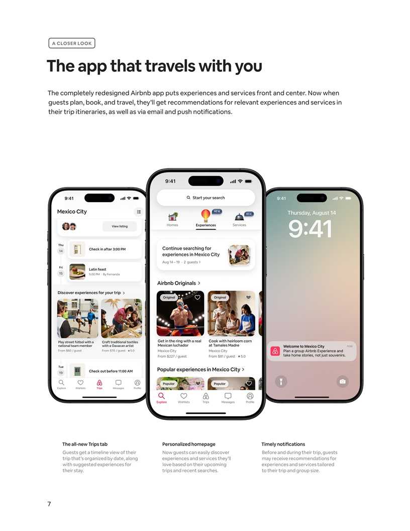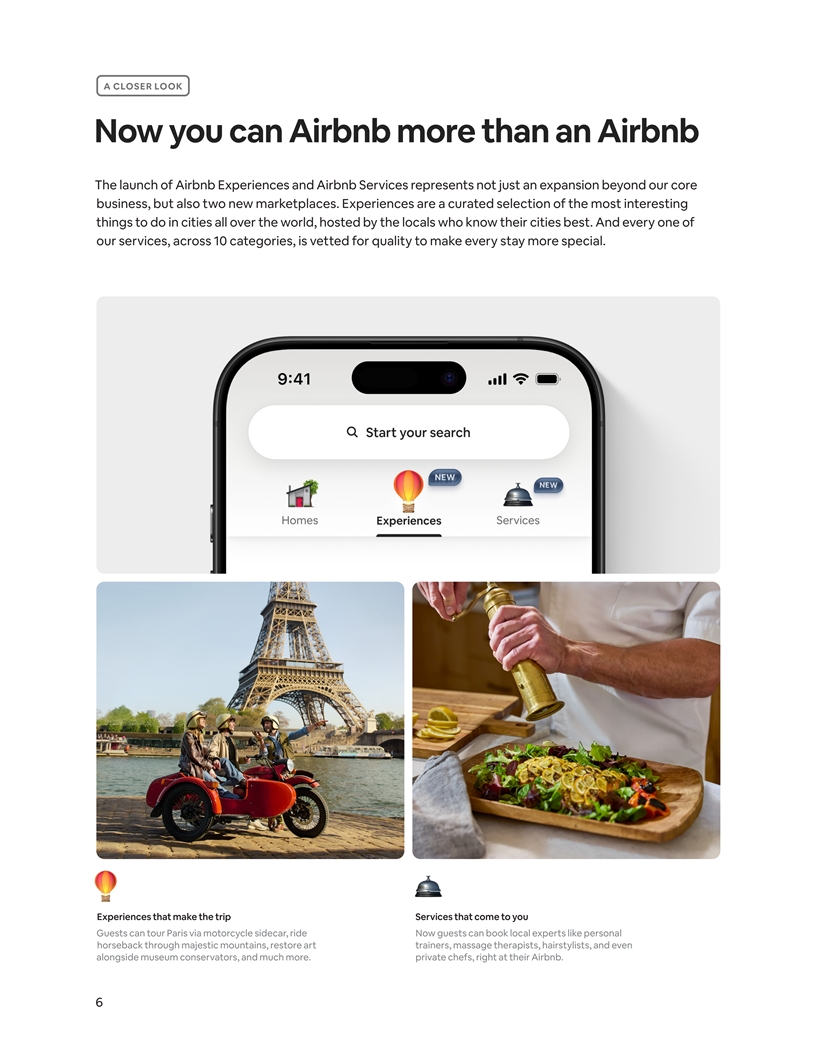 A CLOSER LOOK Now you can Airbnb more than an Airbnb The launch of Airbnb Experiences and Airbnb Services represents not just an expansion beyond our core business, but also two new marketplaces. Experiences are a curated selection of the most interesting things to do in cities all over the world, hosted by the locals who know their cities best. And every one of our services, across 10 categories, is vetted for quality to make every stay more special. Experiences that make the trip Services that come to you Guests can tour Paris via motorcycle sidecar, ride Now guests can book local experts like personal horseback through majestic mountains, restore art trainers, massage therapists, hairstylists, and even alongside museum conservators, and much more. private chefs, right at their Airbnb. 6