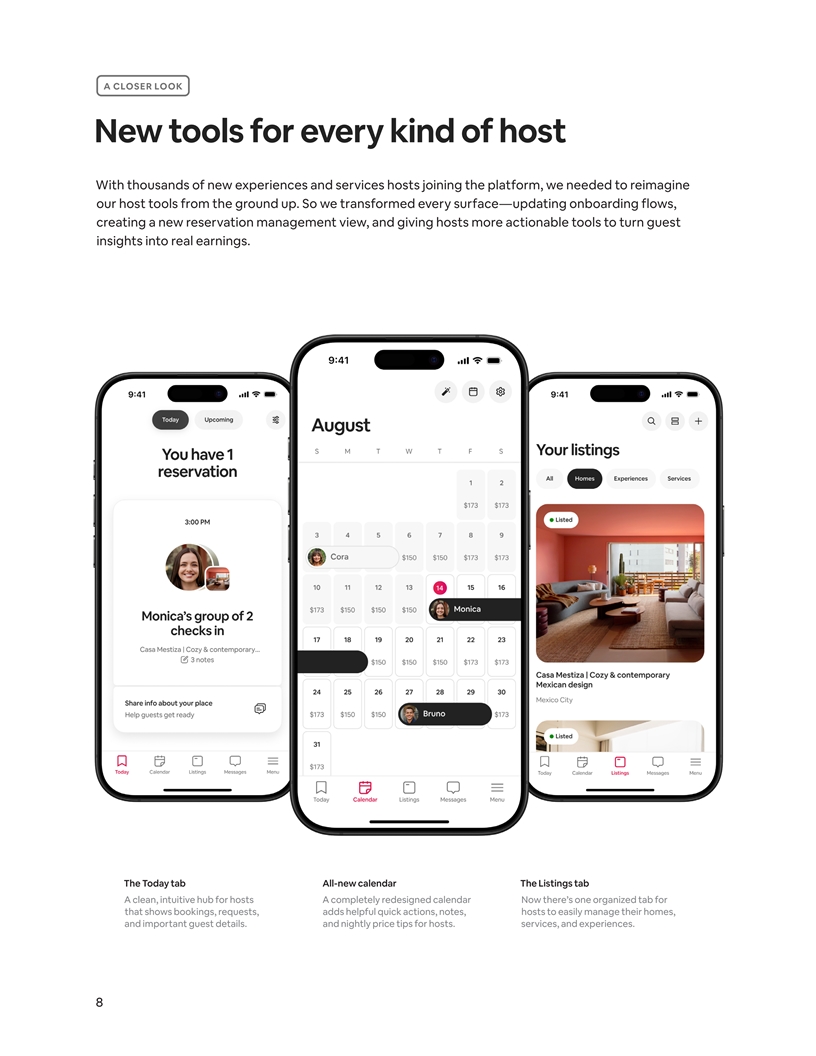 A CLOSER LOOK New tools for every kind of host With thousands of new experiences and services hosts joining the platform, we needed to reimagine our host tools from the ground up. So we transformed every surface—updating onboarding flows, creating a new reservation management view, and giving hosts more actionable tools to turn guest insights into real earnings. The Today tab All-new calendar The Listings tab A clean, intuitive hub for hosts A completely redesigned calendar Now there’s one organized tab for that shows bookings, requests, adds helpful quick actions, notes, hosts to easily manage their homes, and important guest details. and nightly price tips for hosts. services, and experiences. 8