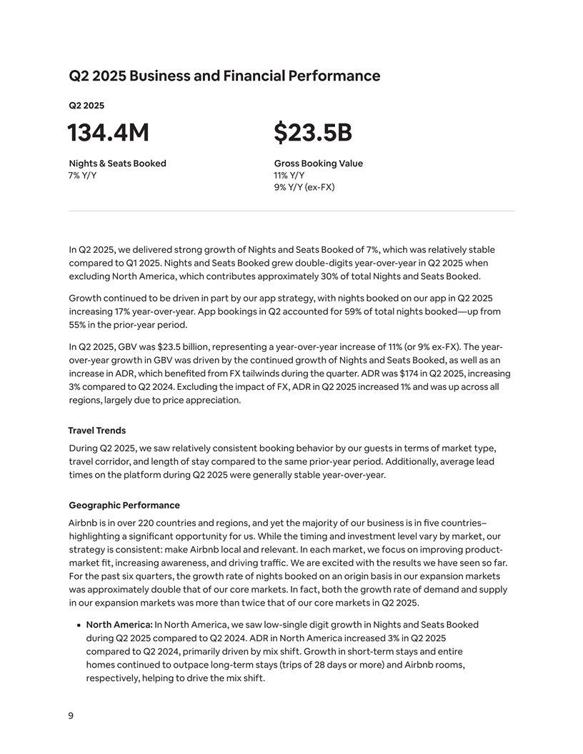 Q2 2025 Business and Financial Performance Q2 2025 134.4M $23.5B Nights & Seats Booked Gross Booking Value 7% Y/Y 11% Y/Y 9% Y/Y (ex-FX) In Q2 2025, we delivered strong growth of Nights and Seats Booked of 7%, which was relatively stable compared to Q1 2025. Nights and Seats Booked grew double-digits year-over-year in Q2 2025 when excluding North America, which contributes approximately 30% of total Nights and Seats Booked. Growth continued to be driven in part by our app strategy, with nights booked on our app in Q2 2025 increasing 17% year-over-year. App bookings in Q2 accounted for 59% of total nights booked—up from 55% in the prior-year period. In Q2 2025, GBV was $23.5 billion, representing a year-over-year increase of 11% (or 9% ex-FX). The year- over-year growth in GBV was driven by the continued growth of Nights and Seats Booked, as well as an increase in ADR, which benefited from FX tailwinds during the quarter. ADR was $174 in Q2 2025, increasing 3% compared to Q2 2024. Excluding the impact of FX, ADR in Q2 2025 increased 1% and was up across all regions, largely due to price appreciation. Travel Trends During Q2 2025, we saw relatively consistent booking behavior by our guests in terms of market type, travel corridor, and length of stay compared to the same prior-year period. Additionally, average lead times on the platform during Q2 2025 were generally stable year-over-year. Geographic Performance Airbnb is in over 220 countries and regions, and yet the majority of our business is in five countries– highlighting a significant opportunity for us. While the timing and investment level vary by market, our strategy is consistent: make Airbnb local and relevant. In each market, we focus on improving product- market fit, increasing awareness, and driving traffic. We are excited with the results we have seen so far. For the past six quarters, the growth rate of nights booked on an origin basis in our expansion markets was approximately double that of our core markets. In fact, both the growth rate of demand and supply in our expansion markets was more than twice that of our core markets in Q2 2025. ¦ North America: In North America, we saw low-single digit growth in Nights and Seats Booked during Q2 2025 compared to Q2 2024. ADR in North America increased 3% in Q2 2025 compared to Q2 2024, primarily driven by mix shift. Growth in short-term stays and entire homes continued to outpace long-term stays (trips of 28 days or more) and Airbnb rooms, respectively, helping to drive the mix shift. 9