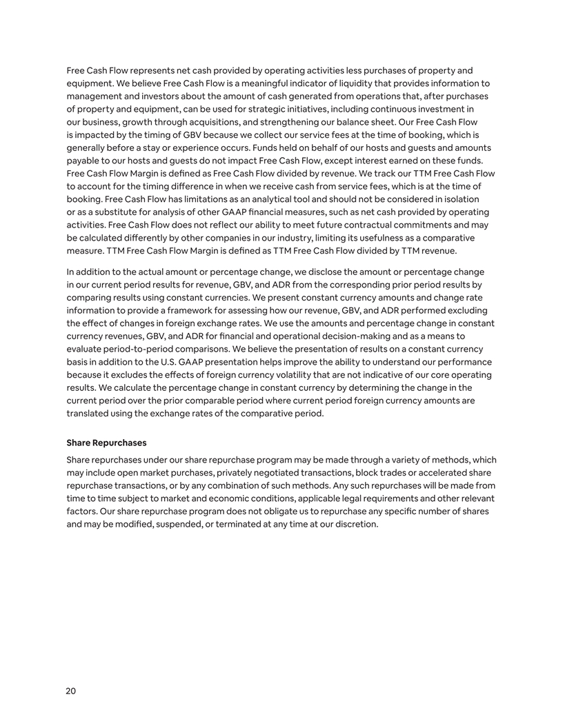 Free Cash Flow represents net cash provided by operating activities less purchases of property and equipment. We believe Free Cash Flow is a meaningful indicator of liquidity that provides information to management and investors about the amount of cash generated from operations that, after purchases of property and equipment, can be used for strategic initiatives, including continuous investment in our business, growth through acquisitions, and strengthening our balance sheet. Our Free Cash Flow is impacted by the timing of GBV because we collect our service fees at the time of booking, which is generally before a stay or experience occurs. Funds held on behalf of our hosts and guests and amounts payable to our hosts and guests do not impact Free Cash Flow, except interest earned on these funds. Free Cash Flow Margin is defined as Free Cash Flow divided by revenue. We track our TTM Free Cash Flow to account for the timing difference in when we receive cash from service fees, which is at the time of booking. Free Cash Flow has limitations as an analytical tool and should not be considered in isolation or as a substitute for analysis of other GAAP financial measures, such as net cash provided by operating activities. Free Cash Flow does not reflect our ability to meet future contractual commitments and may be calculated differently by other companies in our industry, limiting its usefulness as a comparative measure. TTM Free Cash Flow Margin is defined as TTM Free Cash Flow divided by TTM revenue. In addition to the actual amount or percentage change, we disclose the amount or percentage change in our current period results for revenue, GBV, and ADR from the corresponding prior period results by comparing results using constant currencies. We present constant currency amounts and change rate information to provide a framework for assessing how our revenue, GBV, and ADR performed excluding the ee ff ct of changes in foreign exchange rates. We use the amounts and percentage change in constant currency revenues, GBV, and ADR for financial and operational decision-making and as a means to evaluate period-to-period comparisons. We believe the presentation of results on a constant currency basis in addition to the U.S. GAAP presentation helps improve the ability to understand our performance because it excludes the effects of foreign currency volatility that are not indicative of our core operating results. We calculate the percentage change in constant currency by determining the change in the current period over the prior comparable period where current period foreign currency amounts are translated using the exchange rates of the comparative period. Share Repurchases Share repurchases under our share repurchase program may be made through a variety of methods, which may include open market purchases, privately negotiated transactions, block trades or accelerated share repurchase transactions, or by any combination of such methods. Any such repurchases will be made from time to time subject to market and economic conditions, applicable legal requirements and other relevant factors. Our share repurchase program does not obligate us to repurchase any specific number of shares and may be modified, suspended, or terminated at any time at our discretion. 20