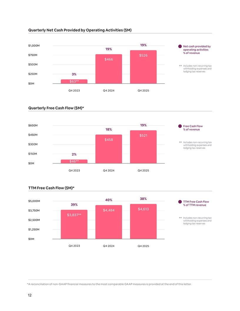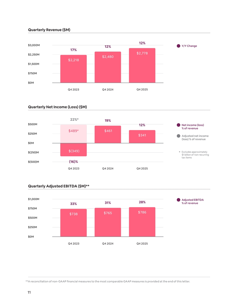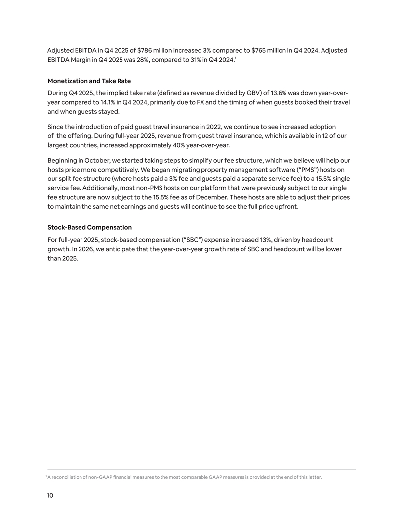 Adjusted EBITDA in Q4 2025 of $786 million increased 3% compared to $765 million in Q4 2024. Adjusted EBITDA Margin in Q4 2025 was 28%, compared to 31% in Q4 2024.¹ Monetization and Take Rate During Q4 2025, the implied take rate (defined as revenue divided by GBV) of 13.6% was down year-over- year compared to 14.1% in Q4 2024, primarily due to FX and the timing of when guests booked their travel and when guests stayed. Since the introduction of paid guest travel insurance in 2022, we continue to see increased adoption of the offering. During full-year 2025, revenue from guest travel insurance, which is available in 12 of our largest countries, increased approximately 40% year-over-year. Beginning in October, we started taking steps to simplify our fee structure, which we believe will help our hosts price more competitively. We began migrating property management software (“PMS”) hosts on our split fee structure (where hosts paid a 3% fee and guests paid a separate service fee) to a 15.5% single service fee. Additionally, most non-PMS hosts on our platform that were previously subject to our single fee structure are now subject to the 15.5% fee as of December. These hosts are able to adjust their prices to maintain the same net earnings and guests will continue to see the full price upfront. Stock-Based Compensation For full-year 2025, stock-based compensation (“SBC”) expense increased 13%, driven by headcount growth. In 2026, we anticipate that the year-over-year growth rate of SBC and headcount will be lower than 2025. 1 A reconciliation of non-GAAP financial measures to the most comparable GAAP measures is provided at the end of this letter. 10