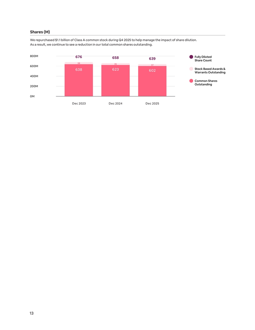 Shares (M) We repurchased $1.1 billion of Class A common stock during Q4 2025 to help manage the impact of share dilution. As a result, we continue to see a reduction in our total common shares outstanding. 13