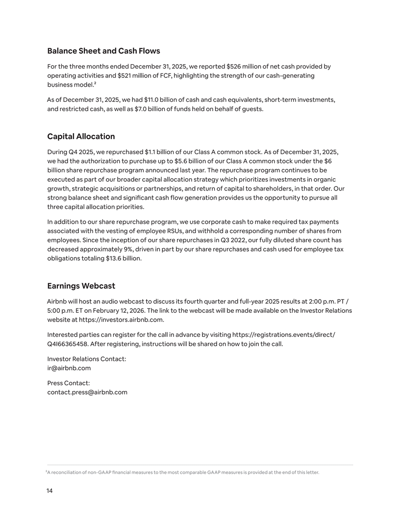 Balance Sheet and Cash Flows For the three months ended December 31, 2025, we reported $526 million of net cash provided by operating activities and $521 million of FCF, highlighting the strength of our cash-generating business model.² As of December 31, 2025, we had $11.0 billion of cash and cash equivalents, short-term investments, and restricted cash, as well as $7.0 billion of funds held on behalf of guests. Capital Allocation During Q4 2025, we repurchased $1.1 billion of our Class A common stock. As of December 31, 2025, we had the authorization to purchase up to $5.6 billion of our Class A common stock under the $6 billion share repurchase program announced last year. The repurchase program continues to be executed as part of our broader capital allocation strategy which prioritizes investments in organic growth, strategic acquisitions or partnerships, and return of capital to shareholders, in that order. Our strong balance sheet and significant cash flow generation provides us the opportunity to pursue all three capital allocation priorities. In addition to our share repurchase program, we use corporate cash to make required tax payments associated with the vesting of employee RSUs, and withhold a corresponding number of shares from employees. Since the inception of our share repurchases in Q3 2022, our fully diluted share count has decreased approximately 9%, driven in part by our share repurchases and cash used for employee tax obligations totaling $13.6 billion. Earnings Webcast Airbnb will host an audio webcast to discuss its fourth quarter and full-year 2025 results at 2:00 p.m. PT / 5:00 p.m. ET on February 12, 2026. The link to the webcast will be made available on the Investor Relations website at https://investors.airbnb.com. Interested parties can register for the call in advance by visiting https://registrations.events/direct/ Q4I66365458. After registering, instructions will be shared on how to join the call. Investor Relations Contact: ir@airbnb.com Press Contact: contact.press@airbnb.com ²A reconciliation of non-GAAP financial measures to the most comparable GAAP measures is provided at the end of this letter. 14