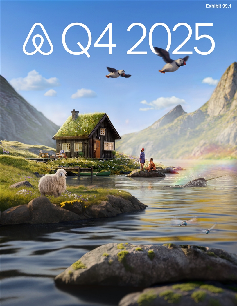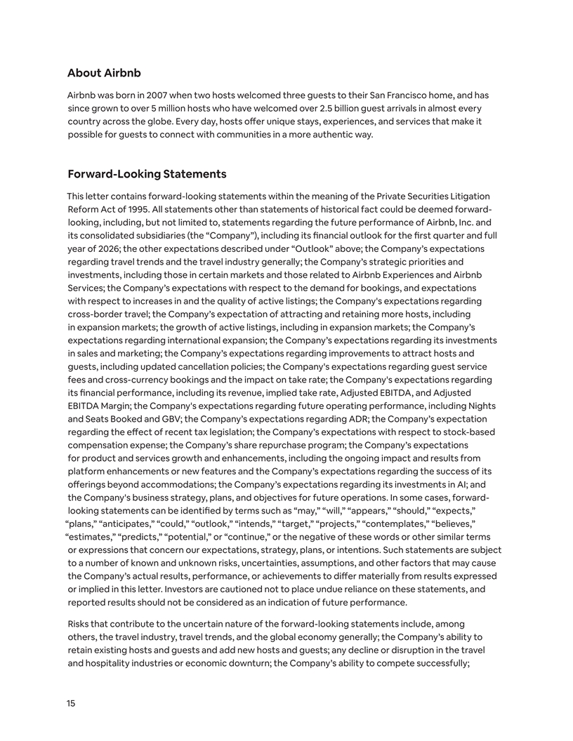 About Airbnb Airbnb was born in 2007 when two hosts welcomed three guests to their San Francisco home, and has since grown to over 5 million hosts who have welcomed over 2.5 billion guest arrivals in almost every country across the globe. Every day, hosts offer unique stays, experiences, and services that make it possible for guests to connect with communities in a more authentic way. Forward-Looking Statements This letter contains forward-looking statements within the meaning of the Private Securities Litigation Reform Act of 1995. All statements other than statements of historical fact could be deemed forward- looking, including, but not limited to, statements regarding the future performance of Airbnb, Inc. and its consolidated subsidiaries (the “Company”), including its financial outlook for the first quarter and full year of 2026; the other expectations described under “Outlook” above; the Company’s expectations regarding travel trends and the travel industry generally; the Company’s strategic priorities and investments, including those in certain markets and those related to Airbnb Experiences and Airbnb Services; the Company’s expectations with respect to the demand for bookings, and expectations with respect to increases in and the quality of active listings; the Company's expectations regarding cross-border travel; the Company’s expectation of attracting and retaining more hosts, including in expansion markets; the growth of active listings, including in expansion markets; the Company’s expectations regarding international expansion; the Company’s expectations regarding its investments in sales and marketing; the Company’s expectations regarding improvements to attract hosts and guests, including updated cancellation policies; the Company's expectations regarding guest service fees and cross-currency bookings and the impact on take rate; the Company's expectations regarding its financial performance, including its revenue, implied take rate, Adjusted EBITDA, and Adjusted EBITDA Margin; the Company's expectations regarding future operating performance, including Nights and Seats Booked and GBV; the Company’s expectations regarding ADR; the Company’s expectation regarding the effect of recent tax legislation; the Company’s expectations with respect to stock-based compensation expense; the Company’s share repurchase program; the Company’s expectations for product and services growth and enhancements, including the ongoing impact and results from platform enhancements or new features and the Company’s expectations regarding the success of its offerings beyond accommodations; the Company’s expectations regarding its investments in AI; and the Company's business strategy, plans, and objectives for future operations. In some cases, forward- looking statements can be identified by terms such as “may,” “will,” “appears,” “should,” “expects,” “plans,” “anticipates,” “could,” “outlook,” “intends,” “target,” “projects,” “contemplates,” “believes,” “estimates,” “predicts,” “potential,” or “continue,” or the negative of these words or other similar terms or expressions that concern our expectations, strategy, plans, or intentions. Such statements are subject to a number of known and unknown risks, uncertainties, assumptions, and other factors that may cause the Company’s actual results, performance, or achievements to differ materially from results expressed or implied in this letter. Investors are cautioned not to place undue reliance on these statements, and reported results should not be considered as an indication of future performance. Risks that contribute to the uncertain nature of the forward-looking statements include, among others, the travel industry, travel trends, and the global economy generally; the Company’s ability to retain existing hosts and guests and add new hosts and guests; any decline or disruption in the travel and hospitality industries or economic downturn; the Company’s ability to compete successfully; 15