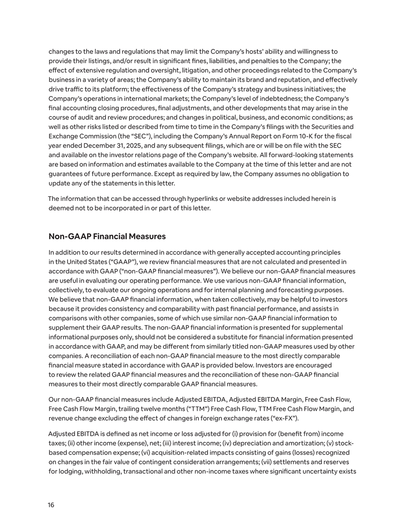 changes to the laws and regulations that may limit the Company’s hosts’ ability and willingness to provide their listings, and/or result in significant fines, liabilities, and penalties to the Company; the effect of extensive regulation and oversight, litigation, and other proceedings related to the Company’s business in a variety of areas; the Company’s ability to maintain its brand and reputation, and effectively drive traffic to its platform; the effectiveness of the Company’s strategy and business initiatives; the Company’s operations in international markets; the Company’s level of indebtedness; the Company’s final accounting closing procedures, final adjustments, and other developments that may arise in the course of audit and review procedures; and changes in political, business, and economic conditions; as well as other risks listed or described from time to time in the Company’s filings with the Securities and Exchange Commission (the “SEC”), including the Company’s Annual Report on Form 10-K for the fiscal year ended December 31, 2025, and any subsequent filings, which are or will be on file with the SEC and available on the investor relations page of the Company’s website. All forward-looking statements are based on information and estimates available to the Company at the time of this letter and are not guarantees of future performance. Except as required by law, the Company assumes no obligation to update any of the statements in this letter. The information that can be accessed through hyperlinks or website addresses included herein is deemed not to be incorporated in or part of this letter. Non-GAAP Financial Measures In addition to our results determined in accordance with generally accepted accounting principles in the United States (“GAAP”), we review financial measures that are not calculated and presented in accordance with GAAP (“non-GAAP financial measures”). We believe our non-GAAP financial measures are useful in evaluating our operating performance. We use various non-GAAP financial information, collectively, to evaluate our ongoing operations and for internal planning and forecasting purposes. We believe that non-GAAP financial information, when taken collectively, may be helpful to investors because it provides consistency and comparability with past financial performance, and assists in comparisons with other companies, some of which use similar non-GAAP financial information to supplement their GAAP results. The non-GAAP financial information is presented for supplemental informational purposes only, should not be considered a substitute for financial information presented in accordance with GAAP, and may be die ff rent from similarly titled non-GAAP measures used by other companies. A reconciliation of each non-GAAP financial measure to the most directly comparable financial measure stated in accordance with GAAP is provided below. Investors are encouraged to review the related GAAP financial measures and the reconciliation of these non-GAAP financial measures to their most directly comparable GAAP financial measures. Our non-GAAP financial measures include Adjusted EBITDA, Adjusted EBITDA Margin, Free Cash Flow, Free Cash Flow Margin, trailing twelve months (“TTM”) Free Cash Flow, TTM Free Cash Flow Margin, and revenue change excluding the effect of changes in foreign exchange rates (“ex-FX”). Adjusted EBITDA is defined as net income or loss adjusted for (i) provision for (benefit from) income taxes; (ii) other income (expense), net; (iii) interest income; (iv) depreciation and amortization; (v) stock- based compensation expense; (vi) acquisition-related impacts consisting of gains (losses) recognized on changes in the fair value of contingent consideration arrangements; (vii) settlements and reserves for lodging, withholding, transactional and other non-income taxes where significant uncertainty exists 16