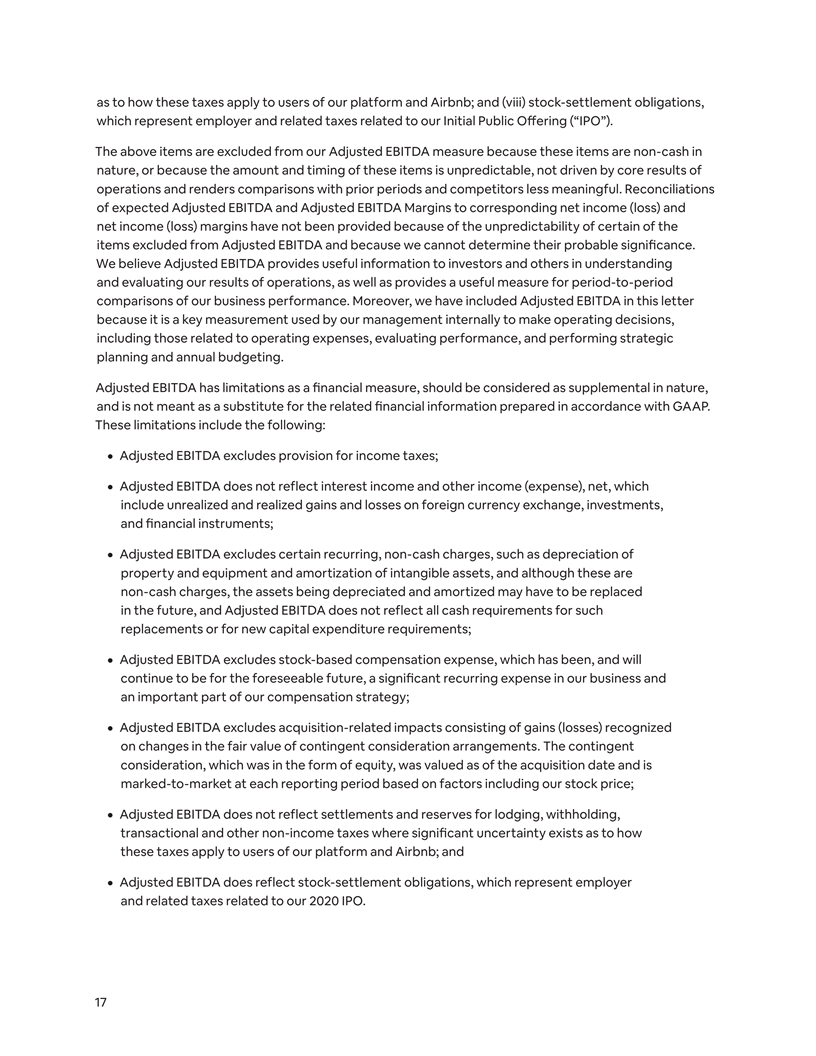 as to how these taxes apply to users of our platform and Airbnb; and (viii) stock-settlement obligations, which represent employer and related taxes related to our Initial Public Offering (“IPO”). The above items are excluded from our Adjusted EBITDA measure because these items are non-cash in nature, or because the amount and timing of these items is unpredictable, not driven by core results of operations and renders comparisons with prior periods and competitors less meaningful. Reconciliations of expected Adjusted EBITDA and Adjusted EBITDA Margins to corresponding net income (loss) and net income (loss) margins have not been provided because of the unpredictability of certain of the items excluded from Adjusted EBITDA and because we cannot determine their probable significance. We believe Adjusted EBITDA provides useful information to investors and others in understanding and evaluating our results of operations, as well as provides a useful measure for period-to-period comparisons of our business performance. Moreover, we have included Adjusted EBITDA in this letter because it is a key measurement used by our management internally to make operating decisions, including those related to operating expenses, evaluating performance, and performing strategic planning and annual budgeting. Adjusted EBITDA has limitations as a financial measure, should be considered as supplemental in nature, and is not meant as a substitute for the related financial information prepared in accordance with GAAP. These limitations include the following: ¦ Adjusted EBITDA excludes provision for income taxes; ¦ Adjusted EBITDA does not reflect interest income and other income (expense), net, which include unrealized and realized gains and losses on foreign currency exchange, investments, and financial instruments; ¦ Adjusted EBITDA excludes certain recurring, non-cash charges, such as depreciation of property and equipment and amortization of intangible assets, and although these are non-cash charges, the assets being depreciated and amortized may have to be replaced in the future, and Adjusted EBITDA does not reflect all cash requirements for such replacements or for new capital expenditure requirements; ¦ Adjusted EBITDA excludes stock-based compensation expense, which has been, and will continue to be for the foreseeable future, a significant recurring expense in our business and an important part of our compensation strategy; ¦ Adjusted EBITDA excludes acquisition-related impacts consisting of gains (losses) recognized on changes in the fair value of contingent consideration arrangements. The contingent consideration, which was in the form of equity, was valued as of the acquisition date and is marked-to-market at each reporting period based on factors including our stock price; ¦ Adjusted EBITDA does not reflect settlements and reserves for lodging, withholding, transactional and other non-income taxes where significant uncertainty exists as to how these taxes apply to users of our platform and Airbnb; and ¦ Adjusted EBITDA does reflect stock-settlement obligations, which represent employer and related taxes related to our 2020 IPO. 17