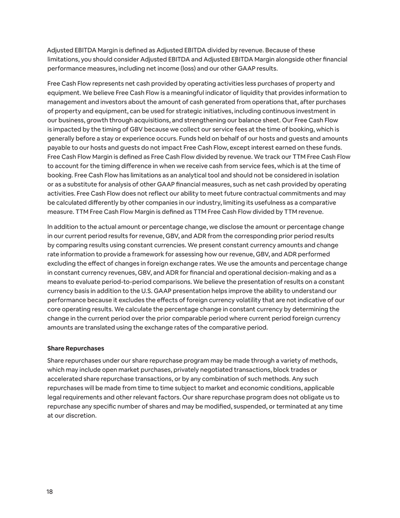 Adjusted EBITDA Margin is defined as Adjusted EBITDA divided by revenue. Because of these limitations, you should consider Adjusted EBITDA and Adjusted EBITDA Margin alongside other financial performance measures, including net income (loss) and our other GAAP results. Free Cash Flow represents net cash provided by operating activities less purchases of property and equipment. We believe Free Cash Flow is a meaningful indicator of liquidity that provides information to management and investors about the amount of cash generated from operations that, after purchases of property and equipment, can be used for strategic initiatives, including continuous investment in our business, growth through acquisitions, and strengthening our balance sheet. Our Free Cash Flow is impacted by the timing of GBV because we collect our service fees at the time of booking, which is generally before a stay or experience occurs. Funds held on behalf of our hosts and guests and amounts payable to our hosts and guests do not impact Free Cash Flow, except interest earned on these funds. Free Cash Flow Margin is defined as Free Cash Flow divided by revenue. We track our TTM Free Cash Flow to account for the timing difference in when we receive cash from service fees, which is at the time of booking. Free Cash Flow has limitations as an analytical tool and should not be considered in isolation or as a substitute for analysis of other GAAP financial measures, such as net cash provided by operating activities. Free Cash Flow does not reflect our ability to meet future contractual commitments and may be calculated differently by other companies in our industry, limiting its usefulness as a comparative measure. TTM Free Cash Flow Margin is defined as TTM Free Cash Flow divided by TTM revenue. In addition to the actual amount or percentage change, we disclose the amount or percentage change in our current period results for revenue, GBV, and ADR from the corresponding prior period results by comparing results using constant currencies. We present constant currency amounts and change rate information to provide a framework for assessing how our revenue, GBV, and ADR performed excluding the effect of changes in foreign exchange rates. We use the amounts and percentage change in constant currency revenues, GBV, and ADR for financial and operational decision-making and as a means to evaluate period-to-period comparisons. We believe the presentation of results on a constant currency basis in addition to the U.S. GAAP presentation helps improve the ability to understand our performance because it excludes the effects of foreign currency volatility that are not indicative of our core operating results. We calculate the percentage change in constant currency by determining the change in the current period over the prior comparable period where current period foreign currency amounts are translated using the exchange rates of the comparative period. Share Repurchases Share repurchases under our share repurchase program may be made through a variety of methods, which may include open market purchases, privately negotiated transactions, block trades or accelerated share repurchase transactions, or by any combination of such methods. Any such repurchases will be made from time to time subject to market and economic conditions, applicable legal requirements and other relevant factors. Our share repurchase program does not obligate us to repurchase any specific number of shares and may be modified, suspended, or terminated at any time at our discretion. 18