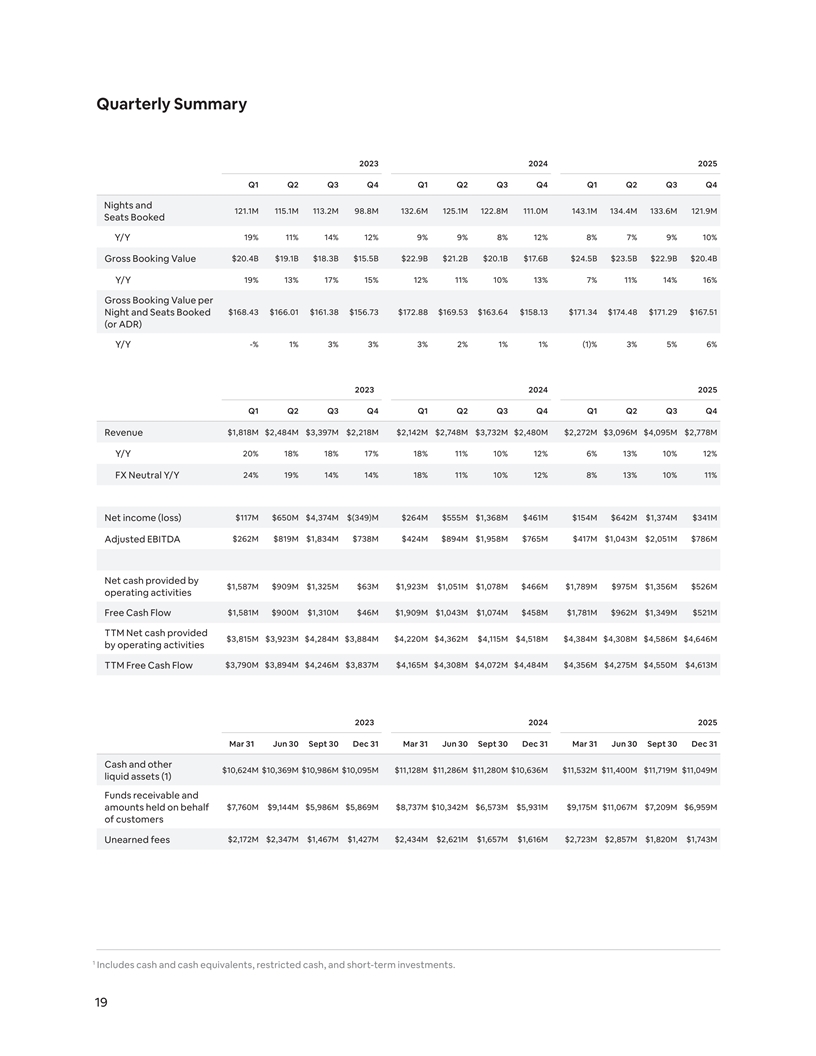 Quarterly Summary 2023 2024 2025 Q1 Q2 Q3 Q4 Q1 Q2 Q3 Q4 Q1 Q2 Q3 Q4 Nights and 121.1M 115.1M 113.2M 98.8M 132.6M 125.1M 122.8M 111.0M 143.1M 134.4M 133.6M 121.9M Seats Booked 19% 11% 14% 12% 9% 9% 8% 12% 8% 7% 9% 10% Y/Y $20.4B $19.1B $18.3B $15.5B $22.9B $21.2B $20.1B $17.6B $24.5B $23.5B $22.9B $20.4B Gross Booking Value 19% 13% 17% 15% 12% 11% 10% 13% 7% 11% 14% 16% Y/Y Gross Booking Value per $168.43 $166.01 $161.38 $156.73 $172.88 $169.53 $163.64 $158.13 $171.34 $174.48 $171.29 $167.51 Night and Seats Booked (or ADR) Y/Y -% 1% 3% 3% 3% 2% 1% 1% (1)% 3% 5% 6% 2023 2024 2025 Q1 Q2 Q3 Q4 Q1 Q2 Q3 Q4 Q1 Q2 Q3 Q4 Revenue $1,818M $2,484M $3,397M $2,218M $2,142M $2,748M $3,732M $2,480M $2,272M $3,096M $4,095M $2,778M Y/Y 20% 18% 18% 17% 18% 11% 10% 12% 6% 13% 10% 12% FX Neutral Y/Y 24% 19% 14% 14% 18% 11% 10% 12% 8% 13% 10% 11% Net income (loss) $117M $650M $4,374M $(349)M $264M $555M $1,368M $461M $154M $642M $1,374M $341M Adjusted EBITDA $262M $819M $1,834M $738M $424M $894M $1,958M $765M $417M $1,043M $2,051M $786M Net cash provided by $1,587M $909M $1,325M $63M $1,923M $1,051M $1,078M $466M $1,789M $975M $1,356M $526M operating activities Free Cash Flow $1,581M $900M $1,310M $46M $1,909M $1,043M $1,074M $458M $1,781M $962M $1,349M $521M TTM Net cash provided $3,815M $3,923M $4,284M $3,884M $4,220M $4,362M $4,115M $4,518M $4,384M $4,308M $4,586M $4,646M by operating activities $3,790M $3,894M $4,246M $3,837M $4,165M $4,308M $4,072M $4,484M $4,356M $4,275M $4,550M $4,613M TTM Free Cash Flow 2023 2024 2025 Mar 31 Jun 30 Sept 30 Dec 31 Mar 31 Jun 30 Sept 30 Dec 31 Mar 31 Jun 30 Sept 30 Dec 31 Cash and other $10,624M $10,369M $10,986M $10,095M $11,128M $11,286M $11,280M $10,636M $11,532M $11,400M $11,719M $11,049M liquid assets (1) Funds receivable and amounts held on behalf $7,760M $9,144M $5,986M $5,869M $8,737M $10,342M $6,573M $5,931M $9,175M $11,067M $7,209M $6,959M of customers Unearned fees $2,172M $2,347M $1,467M $1,427M $2,434M $2,621M $1,657M $1,616M $2,723M $2,857M $1,820M $1,743M 1 Includes cash and cash equivalents, restricted cash, and short-term investments. 19