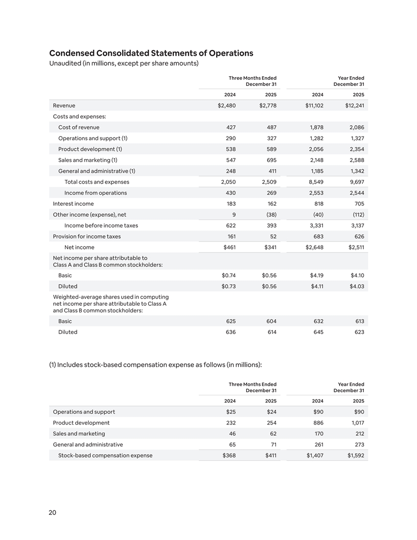Condensed Consolidated Statements of Operations Unaudited (in millions, except per share amounts) Three Months Ended Year Ended December 31 December 31 2024 2025 2024 2025 Revenue $2,480 $2,778 $11,102 $12,241 Costs and expenses: Cost of revenue 427 487 1,878 2,086 Operations and support (1) 290 327 1,282 1,327 Product development (1) 538 589 2,056 2,354 Sales and marketing (1) 547 695 2,148 2,588 General and administrative (1) 248 411 1,185 1,342 Total costs and expenses 2,050 2,509 8,549 9,697 Income from operations 430 269 2,553 2,544 Interest income 183 162 818 705 Other income (expense), net 9 (38) (40) (112) Income before income taxes 622 393 3,331 3,137 Provision for income taxes 161 52 683 626 Net income $461 $341 $2,648 $2,511 Net income per share attributable to Class A and Class B common stockholders: Basic $0.74 $0.56 $4.19 $4.10 Diluted $0.73 $0.56 $4.11 $4.03 Weighted-average shares used in computing net income per share attributable to Class A and Class B common stockholders: Basic 625 604 632 613 Diluted 636 614 645 623 (1) Includes stock-based compensation expense as follows (in millions): Three Months Ended Year Ended December 31 December 31 2024 2025 2024 2025 Operations and support $25 $24 $90 $90 Product development 232 254 886 1,017 Sales and marketing 46 62 170 212 General and administrative 65 71 261 273 Stock-based compensation expense $368 $411 $1,407 $1,592 20