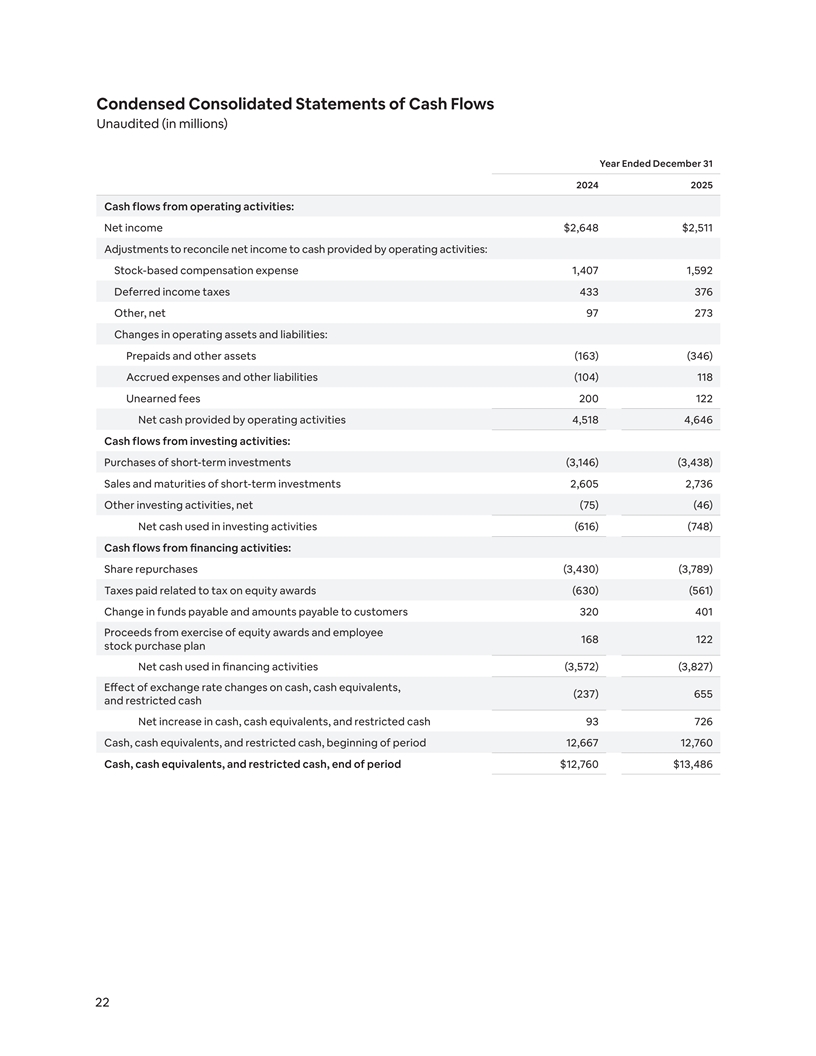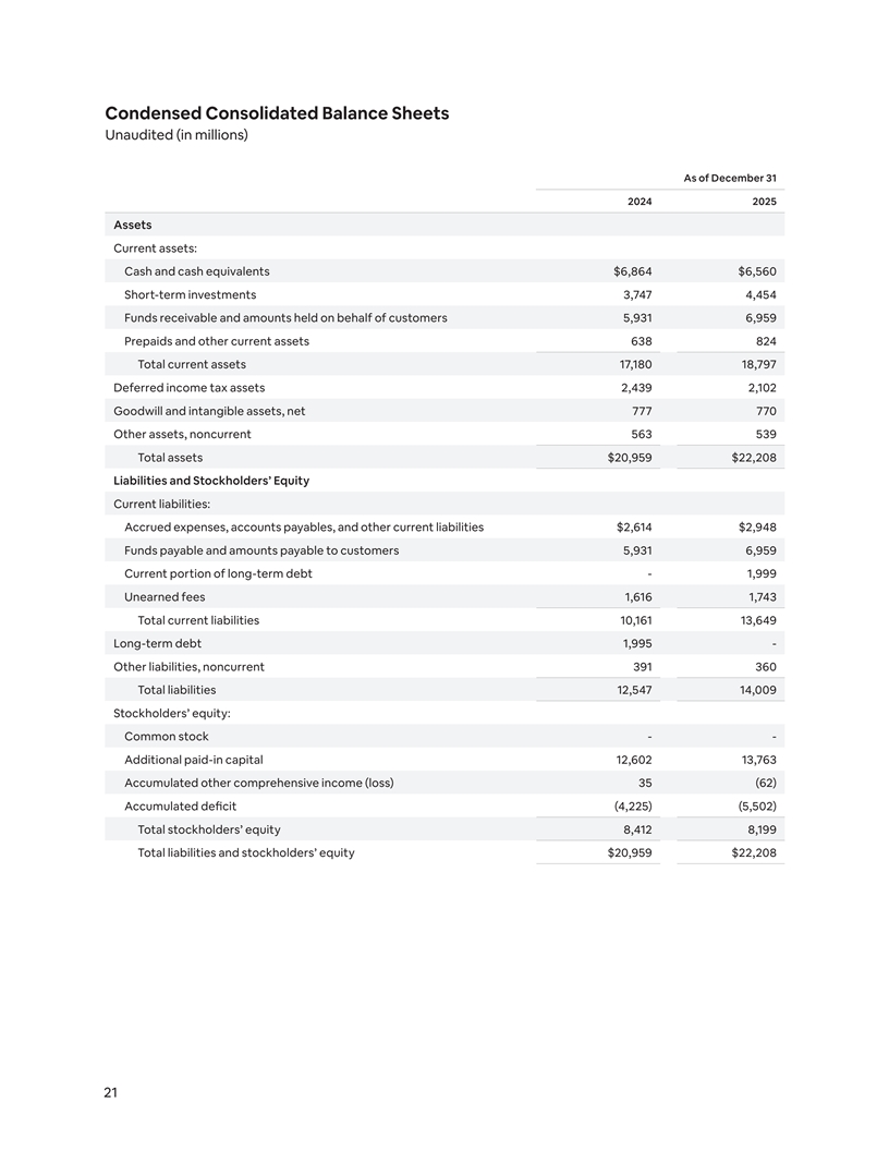 Condensed Consolidated Balance Sheets Unaudited (in millions) As of December 31 2024 2025 Assets Current assets: Cash and cash equivalents $6,864 $6,560 Short-term investments 3,747 4,454 Funds receivable and amounts held on behalf of customers 5,931 6,959 Prepaids and other current assets 638 824 Total current assets 17,180 18,797 Deferred income tax assets 2,439 2,102 Goodwill and intangible assets, net 777 770 Other assets, noncurrent 563 539 Total assets $20,959 $22,208 Liabilities and Stockholders’ Equity Current liabilities: Accrued expenses, accounts payables, and other current liabilities $2,614 $2,948 Funds payable and amounts payable to customers 5,931 6,959 Current portion of long-term debt - 1,999 Unearned fees 1,616 1,743 Total current liabilities 10,161 13,649 Long-term debt 1,995 - Other liabilities, noncurrent 391 360 Total liabilities 12,547 14,009 Stockholders’ equity: Common stock - - Additional paid-in capital 12,602 13,763 Accumulated other comprehensive income (loss) 35 (62) Accumulated deficit (4,225) (5,502) Total stockholders’ equity 8,412 8,199 Total liabilities and stockholders’ equity $20,959 $22,208 21