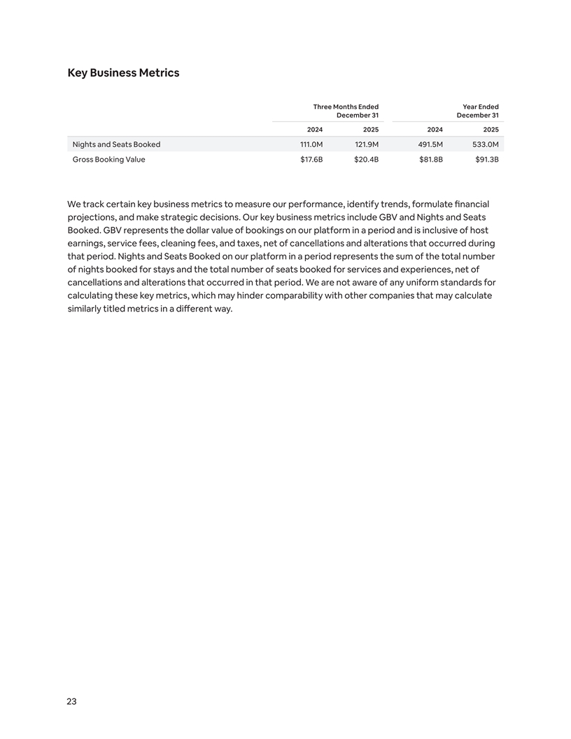 Key Business Metrics Three Months Ended Year Ended December 31 December 31 2024 2025 2024 2025 Nights and Seats Booked 111.0M 121.9M 491.5M 533.0M Gross Booking Value $17.6B $20.4B $81.8B $91.3B We track certain key business metrics to measure our performance, identify trends, formulate financial projections, and make strategic decisions. Our key business metrics include GBV and Nights and Seats Booked. GBV represents the dollar value of bookings on our platform in a period and is inclusive of host earnings, service fees, cleaning fees, and taxes, net of cancellations and alterations that occurred during that period. Nights and Seats Booked on our platform in a period represents the sum of the total number of nights booked for stays and the total number of seats booked for services and experiences, net of cancellations and alterations that occurred in that period. We are not aware of any uniform standards for calculating these key metrics, which may hinder comparability with other companies that may calculate similarly titled metrics in a different way. 23
