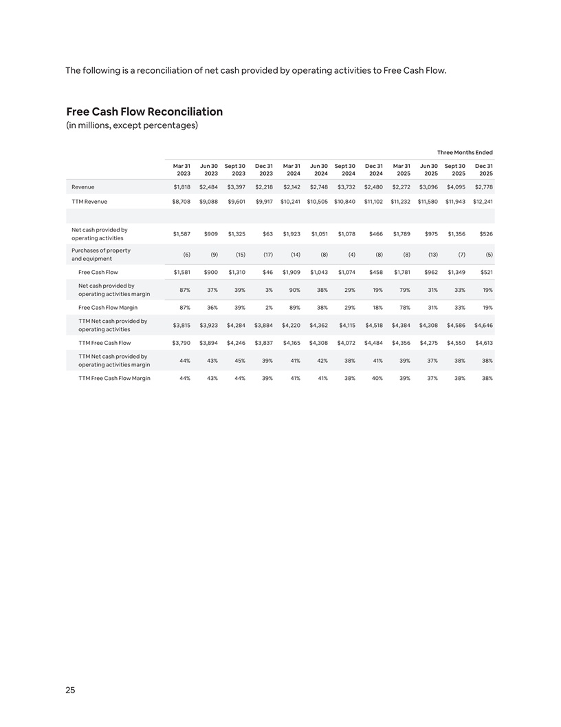 The following is a reconciliation of net cash provided by operating activities to Free Cash Flow. Free Cash Flow Reconciliation (in millions, except percentages) Three Months Ended Mar 31 Jun 30 Sept 30 Dec 31 Mar 31 Jun 30 Sept 30 Dec 31 Mar 31 Jun 30 Sept 30 Dec 31 2023 2023 2023 2023 2024 2024 2024 2024 2025 2025 2025 2025 Revenue $1,818 $2,484 $3,397 $2,218 $2,142 $2,748 $3,732 $2,480 $2,272 $3,096 $4,095 $2,778 TTM Revenue $8,708 $9,088 $9,601 $9,917 $10,241 $10,505 $10,840 $11,102 $11,232 $11,580 $11,943 $12,241 Net cash provided by $1,587 $909 $1,325 $63 $1,923 $1,051 $1,078 $466 $1,789 $975 $1,356 $526 operating activities Purchases of property (6) (9) (15) (17) (14) (8) (4) (8) (8) (13) (7) (5) and equipment Free Cash Flow $1,581 $900 $1,310 $46 $1,909 $1,043 $1,074 $458 $1,781 $962 $1,349 $521 Net cash provided by 87% 37% 39% 3% 90% 38% 29% 19% 79% 31% 33% 19% operating activities margin Free Cash Flow Margin 87% 36% 39% 2% 89% 38% 29% 18% 78% 31% 33% 19% TTM Net cash provided by $3,815 $3,923 $4,284 $3,884 $4,220 $4,362 $4,115 $4,518 $4,384 $4,308 $4,586 $4,646 operating activities TTM Free Cash Flow $3,790 $3,894 $4,246 $3,837 $4,165 $4,308 $4,072 $4,484 $4,356 $4,275 $4,550 $4,613 TTM Net cash provided by 44% 43% 45% 39% 41% 42% 38% 41% 39% 37% 38% 38% operating activities margin TTM Free Cash Flow Margin 44% 43% 44% 39% 41% 41% 38% 40% 39% 37% 38% 38% 25